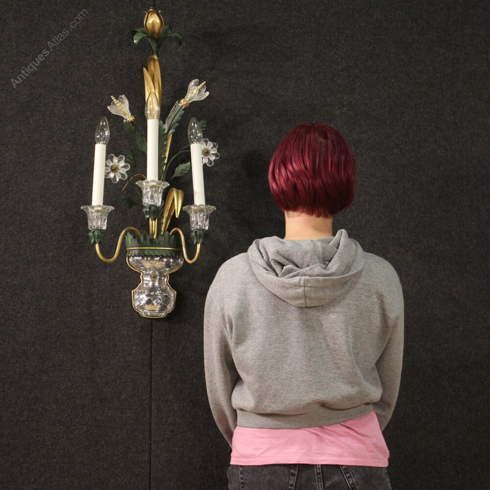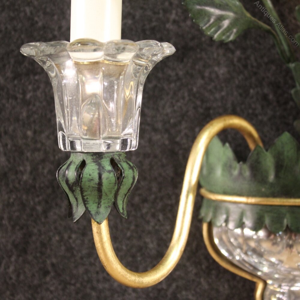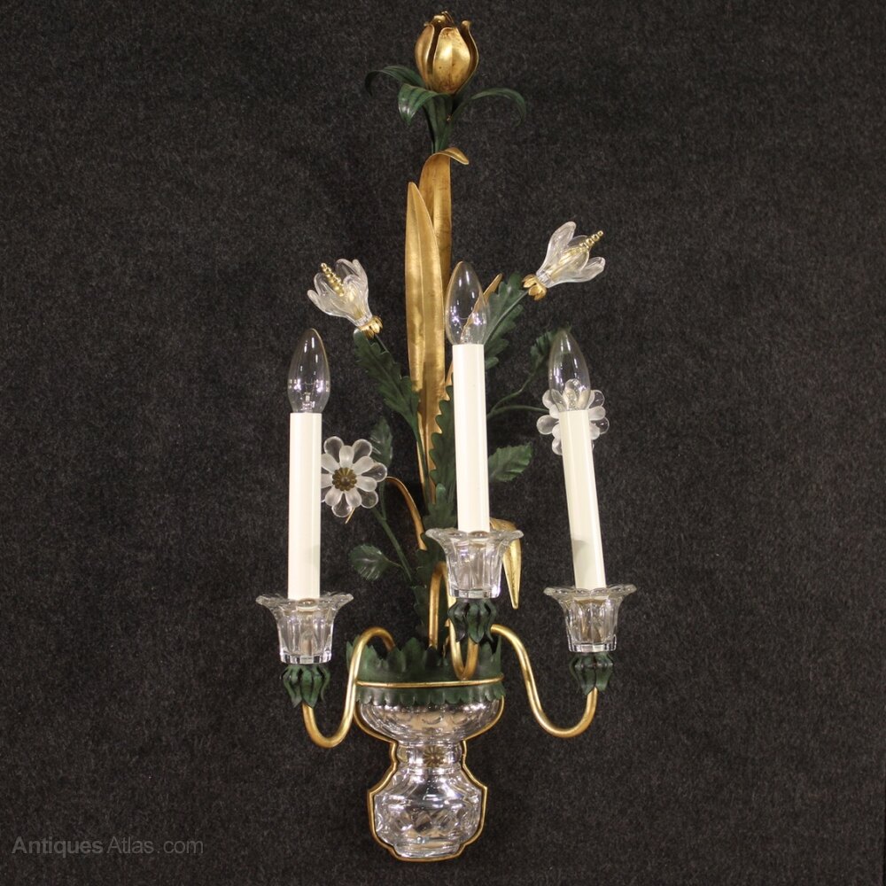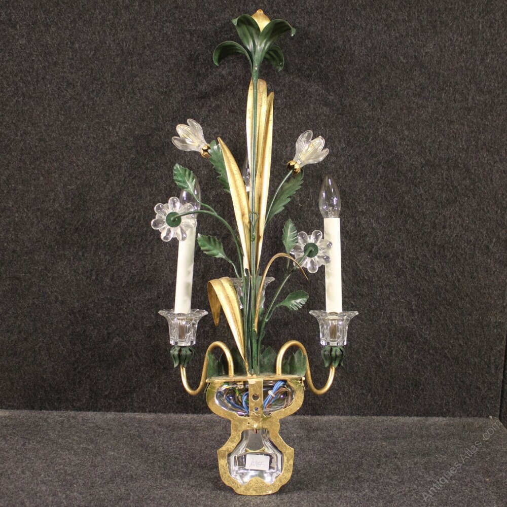 Elegant Italian wall lamp from the 70s. Wall light in crystal and gilded and painted metal of fabulous decor. Three-light wall lamp with electrical system to be overhauled for perfect functioning. Item without brands or stamps referable to the Tuscan production Banci in the French style Maison Bagues. Of great size and impact, the applique can be easily placed in different parts of the house. In good condition, electrical system to be overhauled.