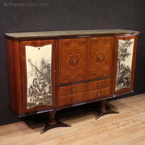 The side doors, complete with original decorative glass panels featuring allegorical views, are in perfect condition. The pearwood interior is structurally sound, showing some signs of wear (see photo). A fabulously furnished bar cabinet, perfect for antique dealers, interior decorators, and lovers of 20th-century Italian furniture. Complete with three working keys, it shows some minor signs of wear. Structurally sound, overall in good condition. As each of our products will be accompanied by a certificate of authenticity and warranty and photographic documentation. Every item will be packed in a custom-made wooden box. Free shipping in Europe and UK (import and custom duties NOT included). Worldwide shipping at affordable prices, ask us a shipping quote. BUY IN INSTALLMENTS INTEREST FREE.