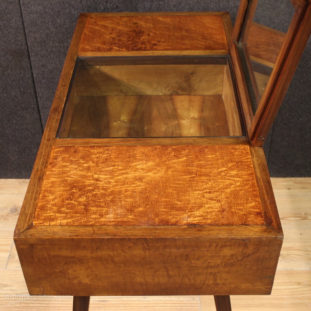 Console table with mirror, Italy, 1970s design. Fabulously designed furniture, veneered in thuja burl with ebonized drawer trim. Small desk with three parallel drawers adorned with original gilded brass handles (see photo). A well-sized and functional wooden top, complete with a central glass panel to reveal the contents of the middle drawer (see photo). The high-legged furniture is supported by four sturdy wooden legs (see photo) for good stability. The original console table with a small, useful mirror is secured to the furniture with special screws. An ideal dressing table for a bedroom or living room, for antique dealers and interior decorators, and beautifully decorated. Structurally sound and solid, it is in good condition.