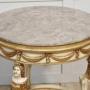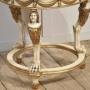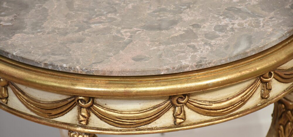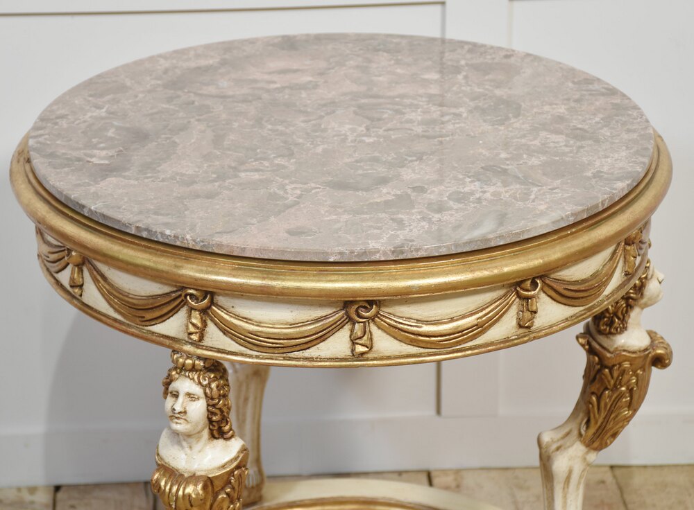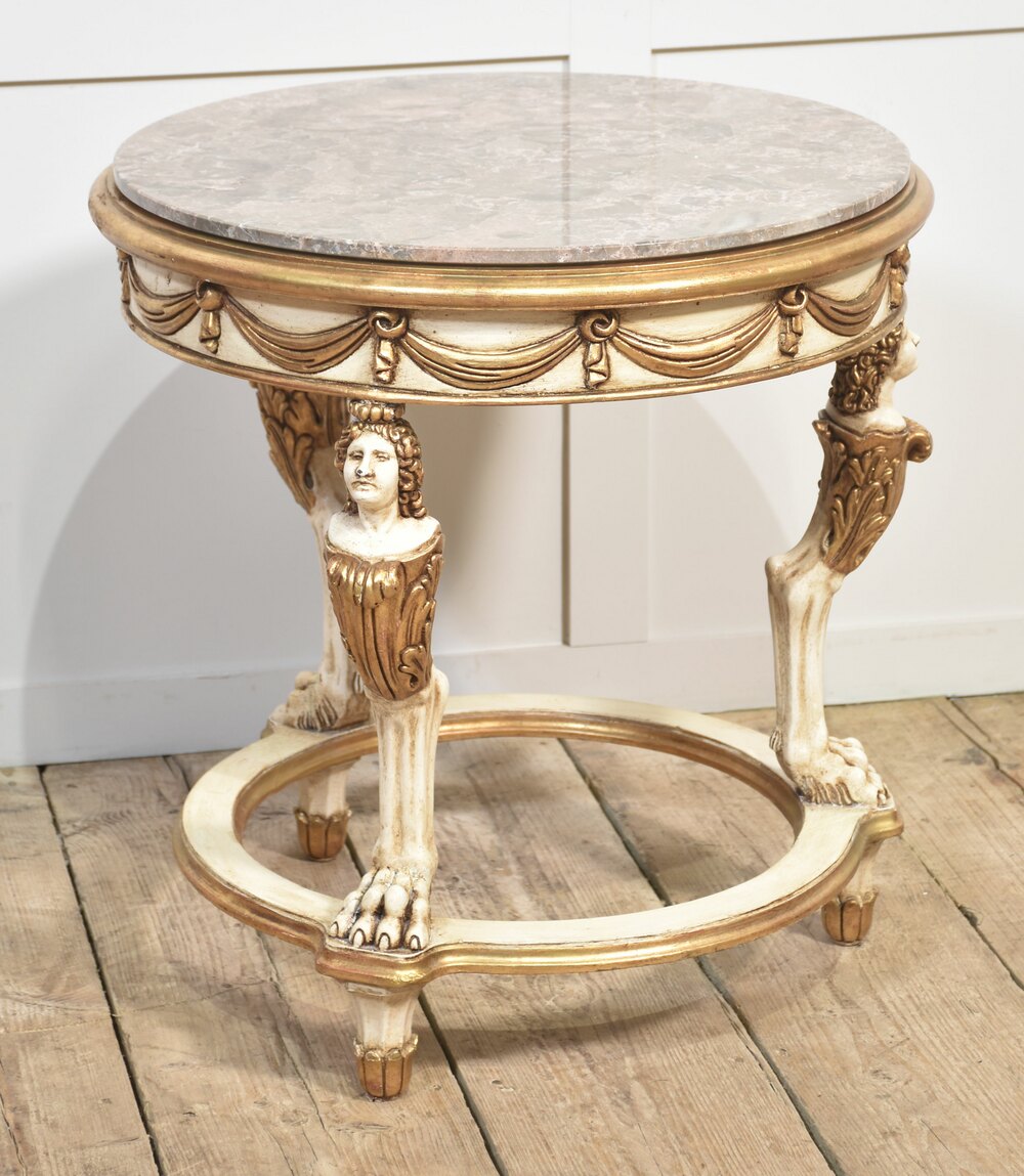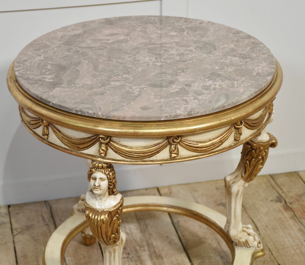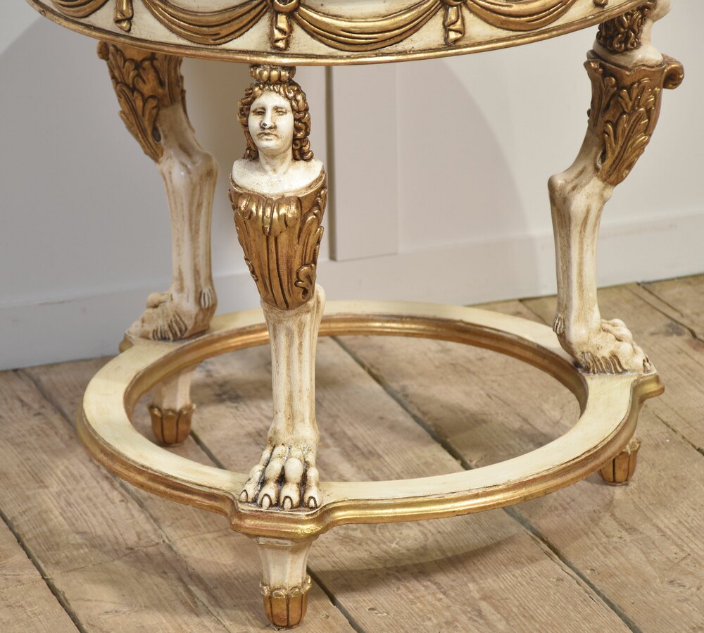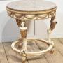 Italian painted and parcel gilt lamp table, of Neo-classical style, the circular marble top above a swag frieze, on figural supports to flower bulb feet.