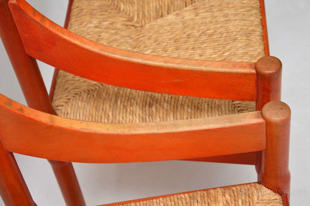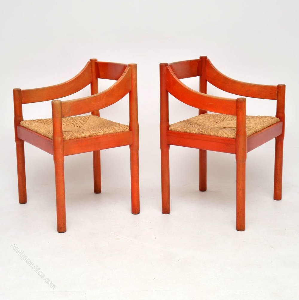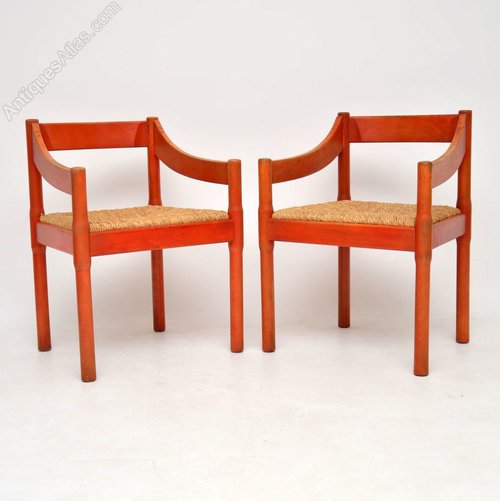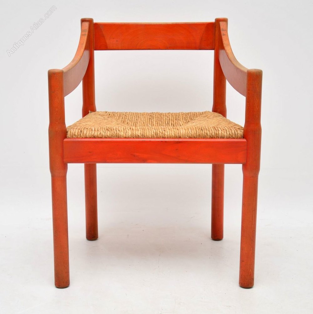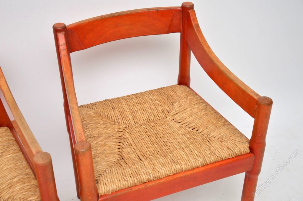 A beautifully deigned pair of carver armchairs by the Italian designer Vico Magistretti, these were made by Cassina and retailed by Habitat in the 1960’s. This pair dates from the 1960’s, the original red lacquered finish has faded to a lovely burnt orange colour. They are in great condition for their age, with only some minor surface wear to be seen. The original woven rush seats are fully intact and in very good condition as well.