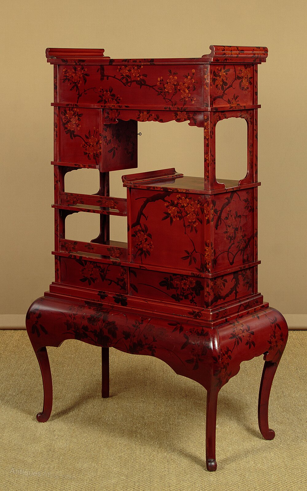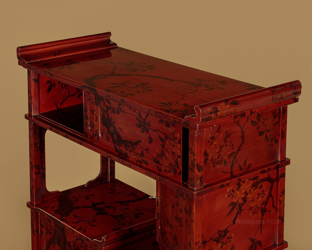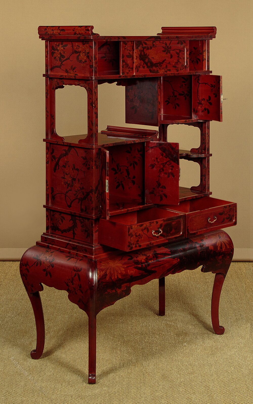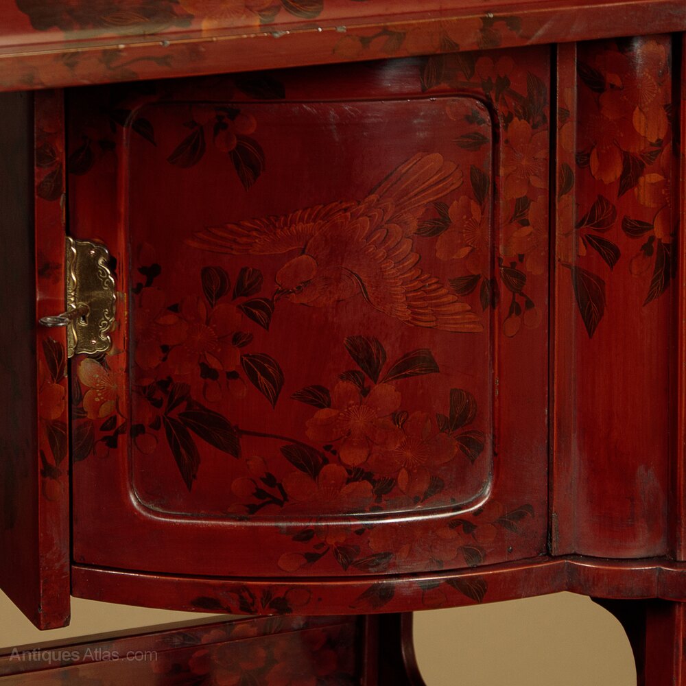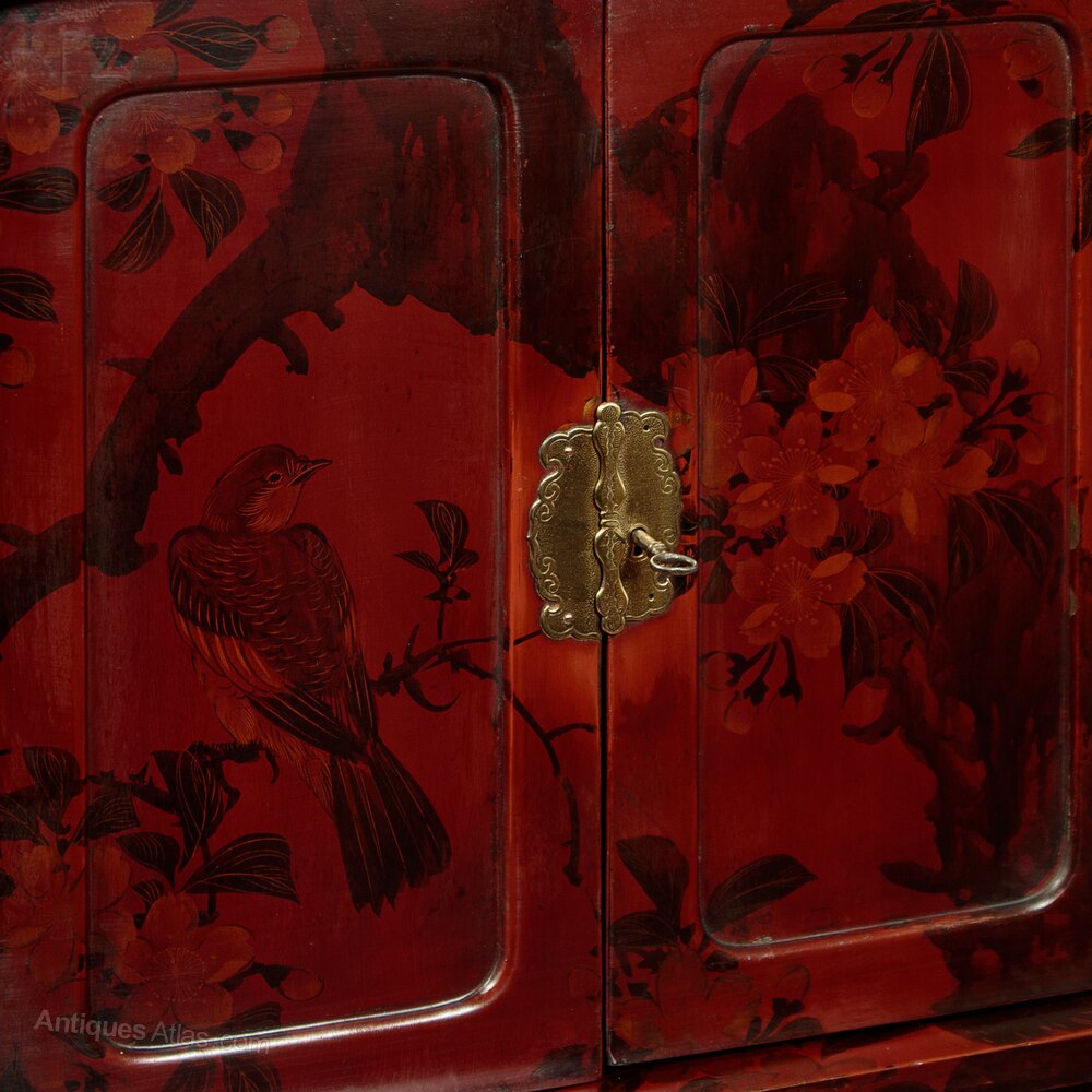 Beautiful Japanese Meiji period lacquered display cabinet or stand c.1900. Flat top for display with raised ends, over a cabinet with sliding doors, a small cupboard with a bow fronted door, three small shelves, a two door cabinet and two drawers. Raised on a separate base. Striking dark red lacquered ground with a lovely decorative scheme featuring a hand painted decoration of a tree with the trunk raising from the base, flanked with chrysanthemum flowers, with the leaves and blossom across the upper portion of the cabinet amongst which several birds are found. Decoration continues on the sides and rear and on the cupboard interiors. Excellent condition, cleaned and waxed in our workshops. Keys supplied.