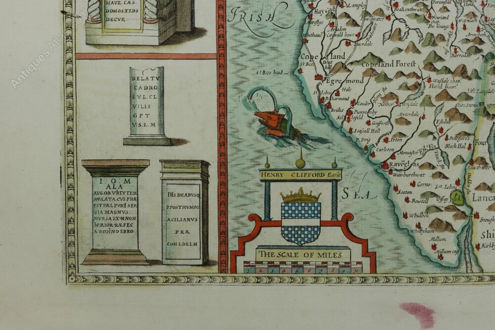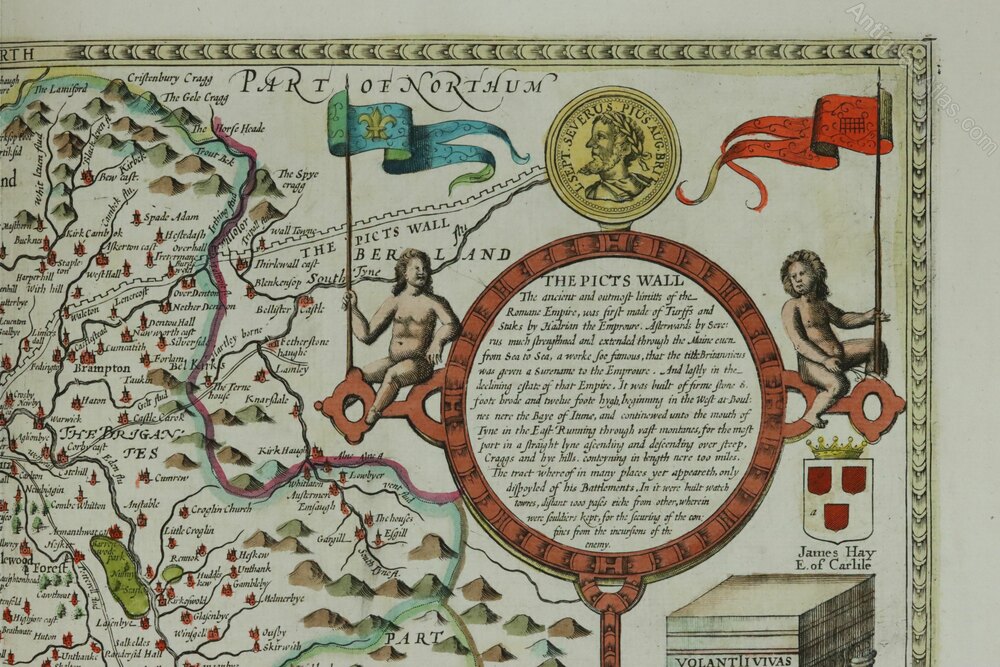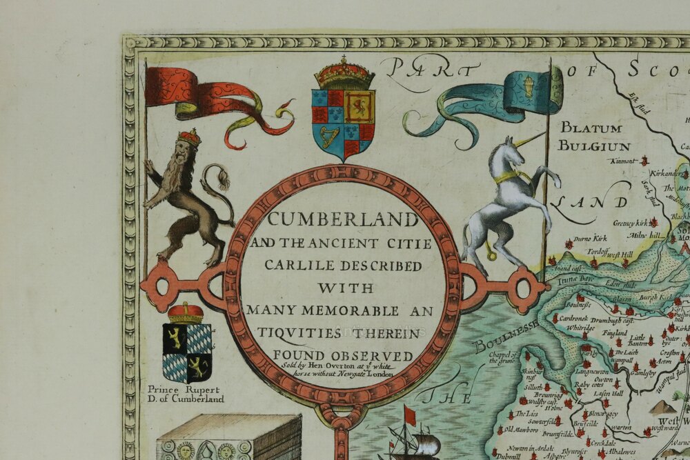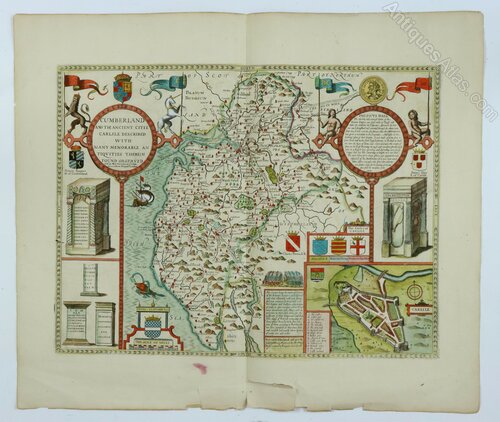 A hand-coloured original early 18th century map by John Speed titled: "CUMBERLAND AND THE ANCIENT CITIE CARLILE DESCRIBED WITH MANY MEMORABLE ANTIQUITIES THEREIN FOUND OBSERVED"