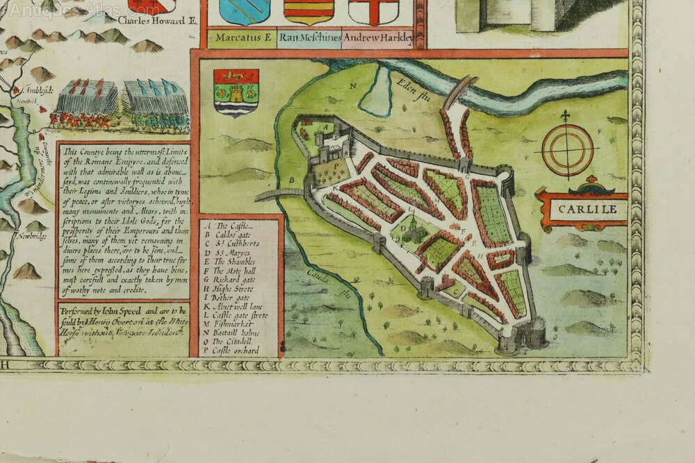 In a box to the left of the town plan of Carlisle it states: “Performed by John Speed and are to be sould by Henry Overton at the White Horse without Newgate, London”