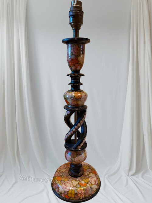 A splendid very decorative polychrome hand painted Kashmiri table lamp. Dating to the 1930s. A taller model than normal featuring an elegant open twist to the stem and in very good original condition. Wired in gold flex and ready to use with your choice of shade. 17 1/4" tall on a 5 1/4" diameter base.