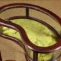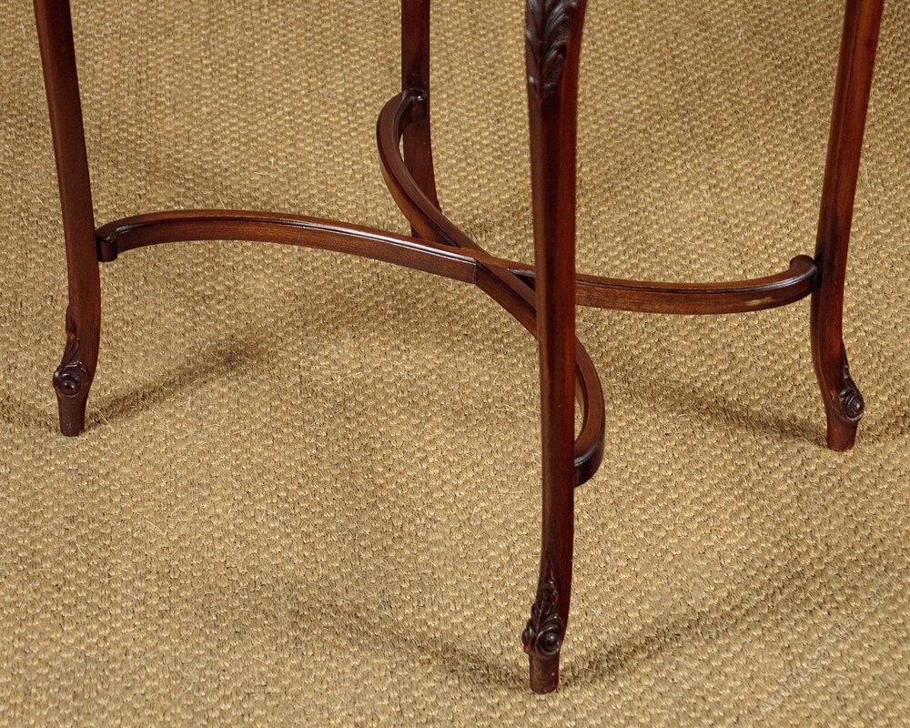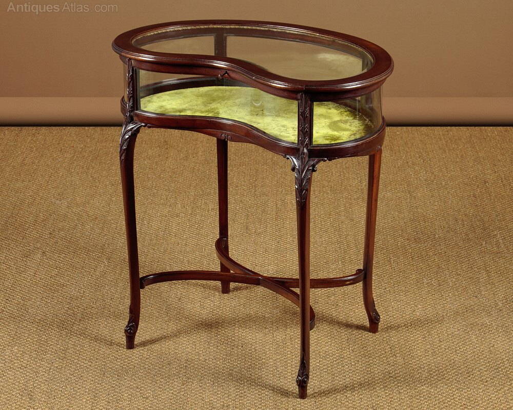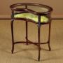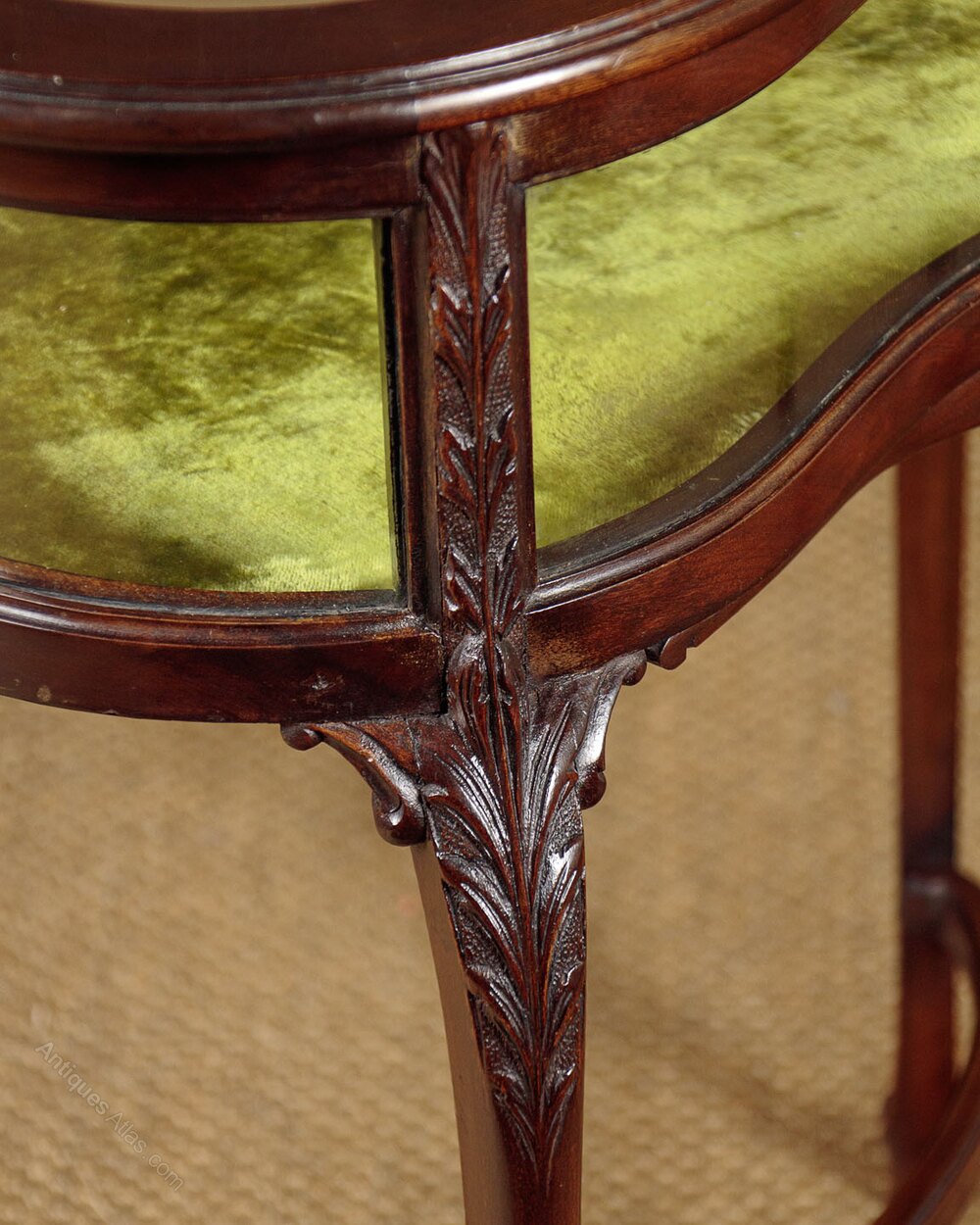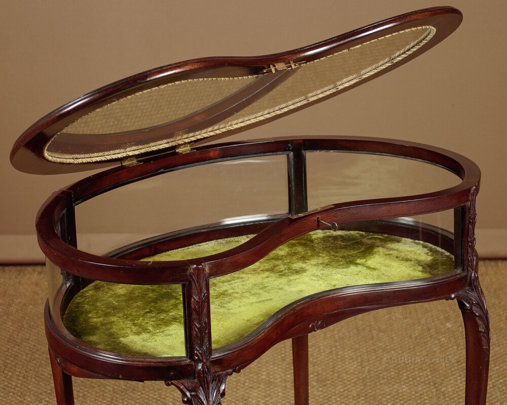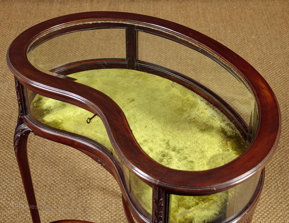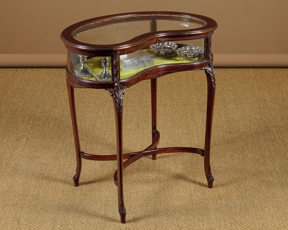 Fine quality mahogany bijouterie or display top table c.1920. Unusual and attractive kidney shape with a lockable display cabinet top (internal height 6"). Glazed lid, front, sides and rear, the base lined in green velvet. Raised on slim cabriole legs with carved detail to the knees and feet at the front and rear. Carving continues on the frame above the legs. Joined with curving stretchers with moulded edges. Some scratches to the glass on the lid, otherwise excellent condition, cleaned and waxed in our workshops. Key supplied.