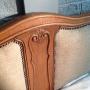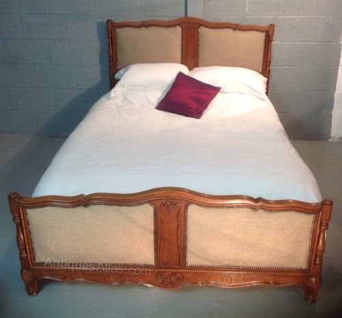 The bed panels have been re upholstered in an oatmeal fabric and finished with antique stud detailing.