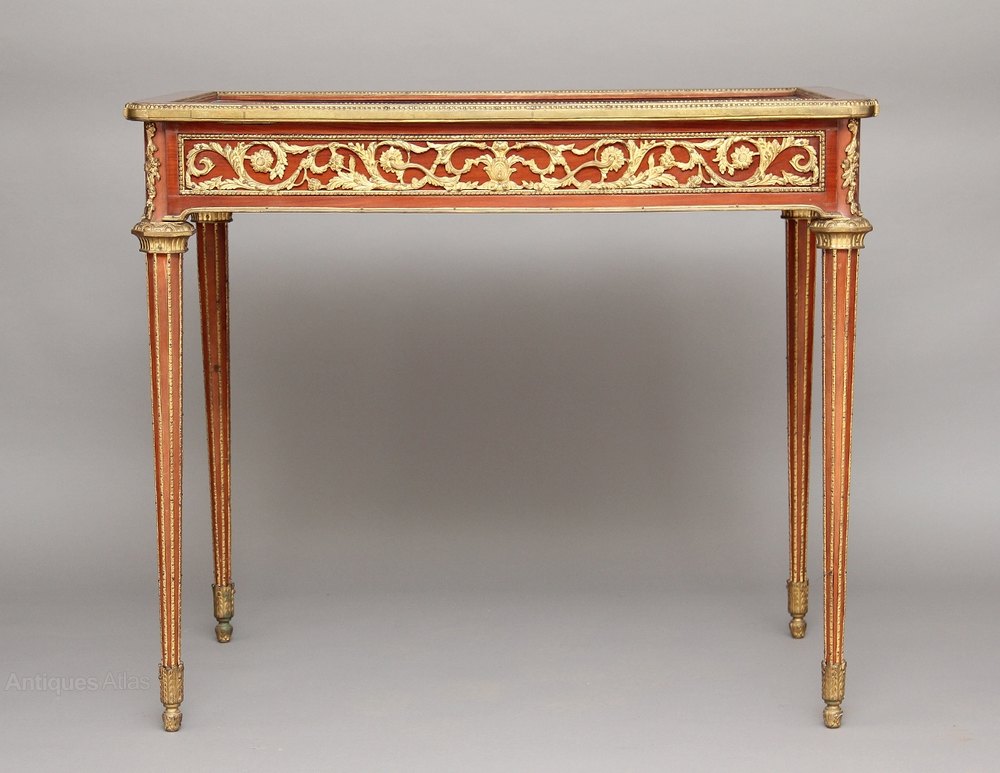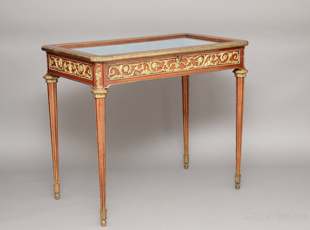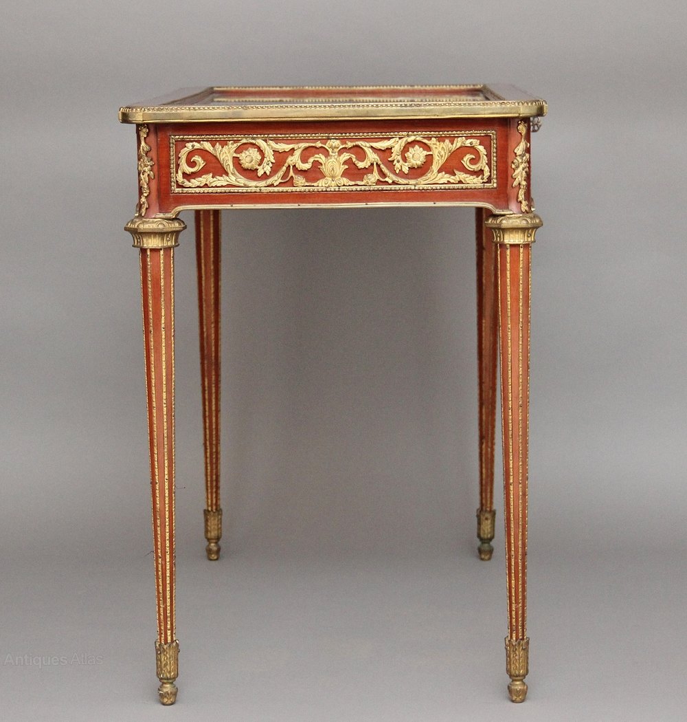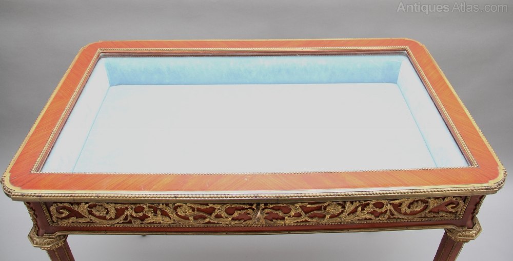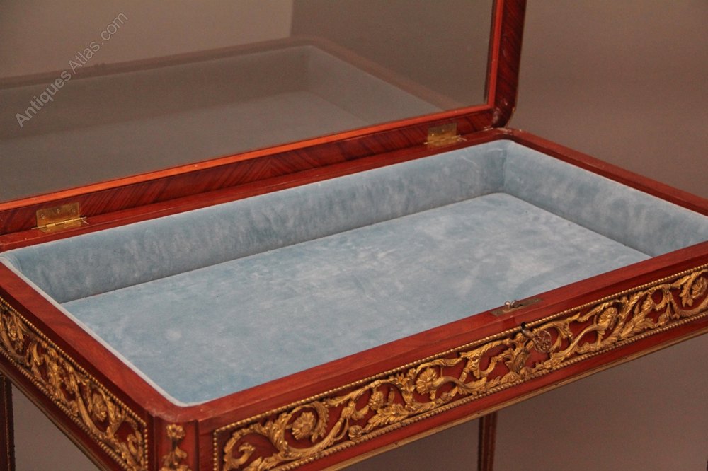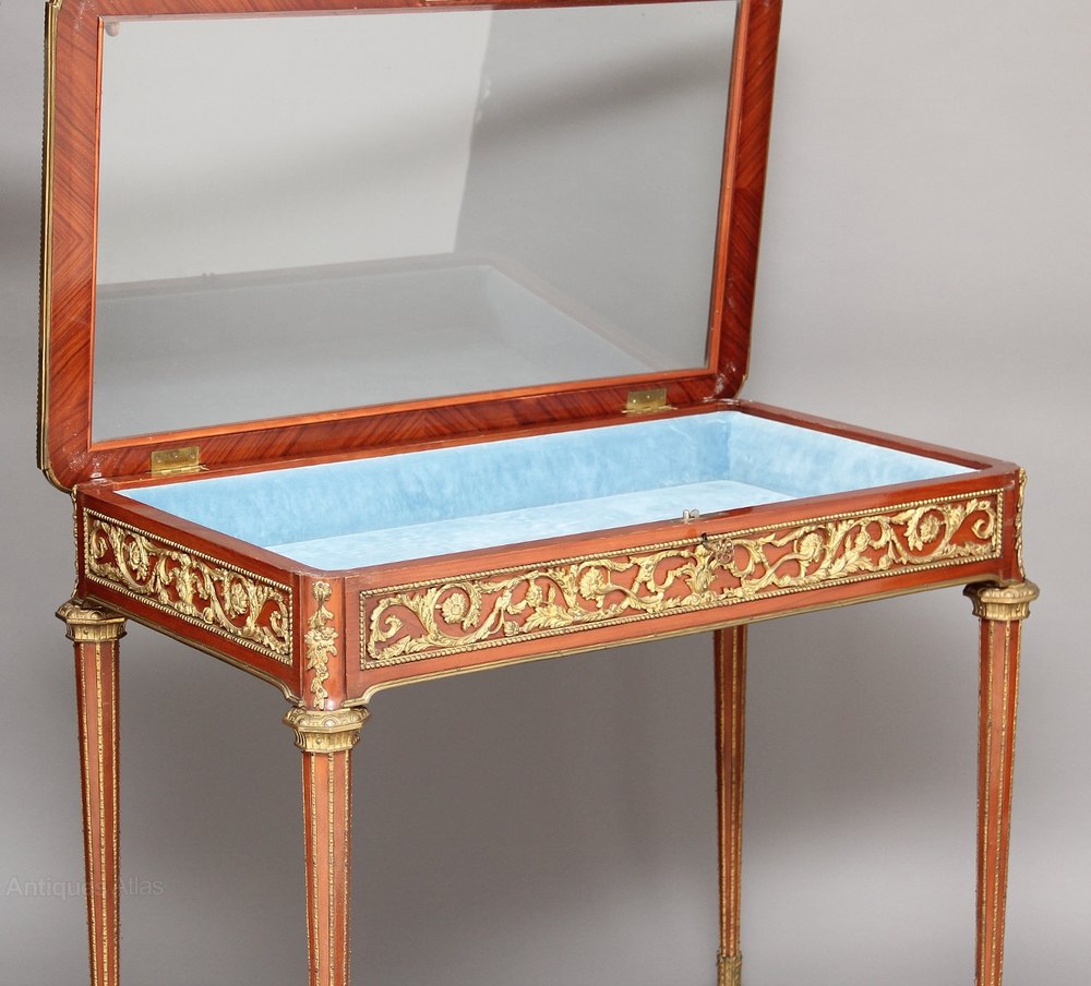 A stunning French ormolu mounted kingwood vitrine / display cabinet, with a lockable lift up lid revealing a pale blue padded lining in excellent condition, standing on ormolu decorated turned legs.