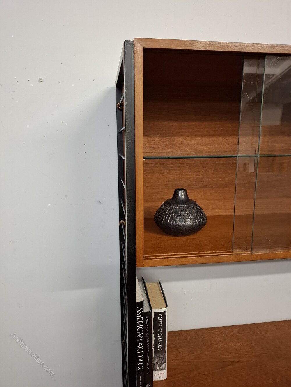 The glazed storage unit comes with two original anti-tip hooks , that are discreetly attached to the ladders for extra stability and safety. There is a shelf which can be fitted to three different heights. All the glass is in perfect condition.