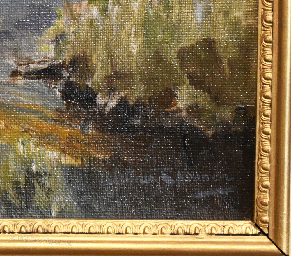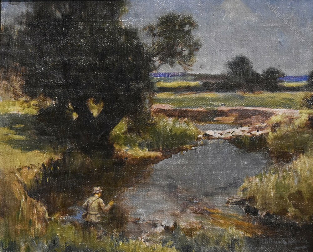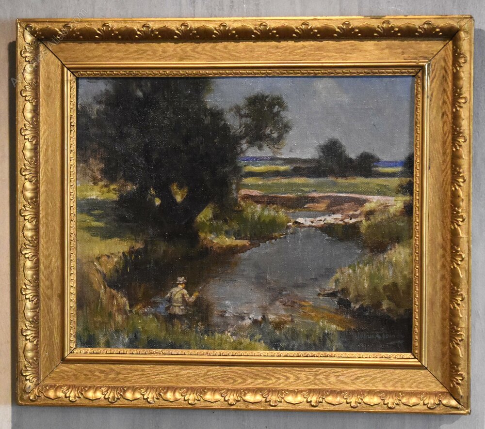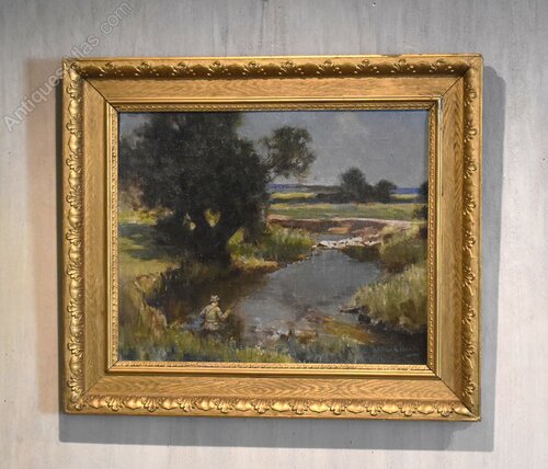 Oil on canvas laid to board depicting a fisherman in a river landscape by Arthur Spooner 1873-1962. The painting depicts in confident impressionist brushstrokes a fisherman casting out into a river on a sunny day, which I suspect was worked from life, plein air. Spooner is famed for painting views of Nottingham and I feel this is probably Wilford, one of his favourite locations. The painting is in good untouched condition with the quite coarse canvas having been laid to a board, the coarser canvas makes me think this work was probably painted during the war or just after. The work is signed to the lower right: ‘Arthur Spooner’. Arthur Spooner 1873-1962 was born in Nottingham and trained at the School of Art there, he also went on to teach landscape and figurative painting there. He was one of the great British impressionist painters, he was a member of the Nottingham Society of Artists and The Royal Society of British Artists and exhibited at every major gallery including a remarkable 144 times in Nottingham and 83 times at The Royal Society of British Artists. This example of his work is a later one I think and shows his mastery of landscape and light. The painting is framed in gilt frame of the early twentieth century which has had some old repairs and is overpainted. The whole is a pleasant decorative work with a peaceful feel. C.1940