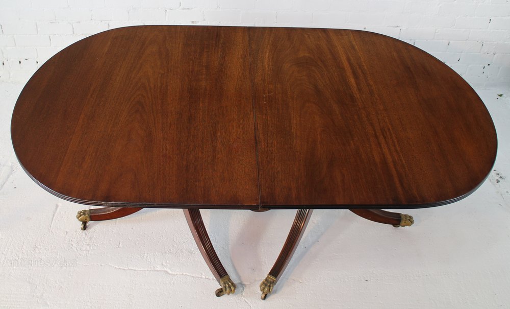 A Regency style twin pedestal dining table dating to c.1900 and with two original leaves, this lovely example of a solid mahogany D-end table has a reeded edge and stands on two turned columns with downswept reeded legs and brass paw caps and castors. The two leaves extend the table from 6ft to either 8 or 10ft depending on whether one or both leaves are used. A good table with a nice colour and grain, a solid feel when extended as the additional leaves are supported on two beams which slot into the underside of the table whilst brass clips pull the joints tight. In very good condition, some signs of age as to be expected but only minor marks and scratches.