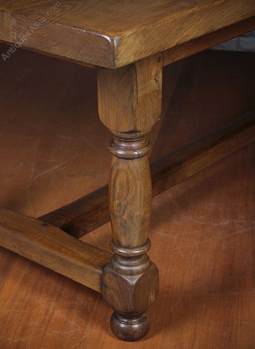 Very sturdy large 18th.c. style oak farmhouse refectory table c.1930. Solid oak construction throughout with a monumental 2″ thick top on turned legs, joined with square end and centre stretchers. To comfortably seat 8. Excellent colour and condition, cleaned and waxed in our workshops.