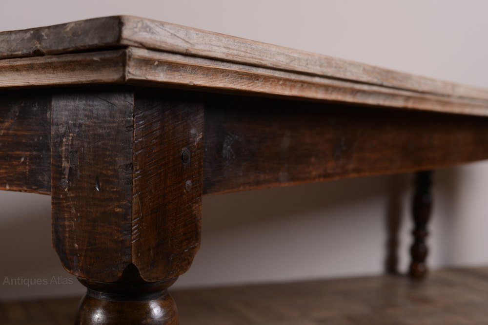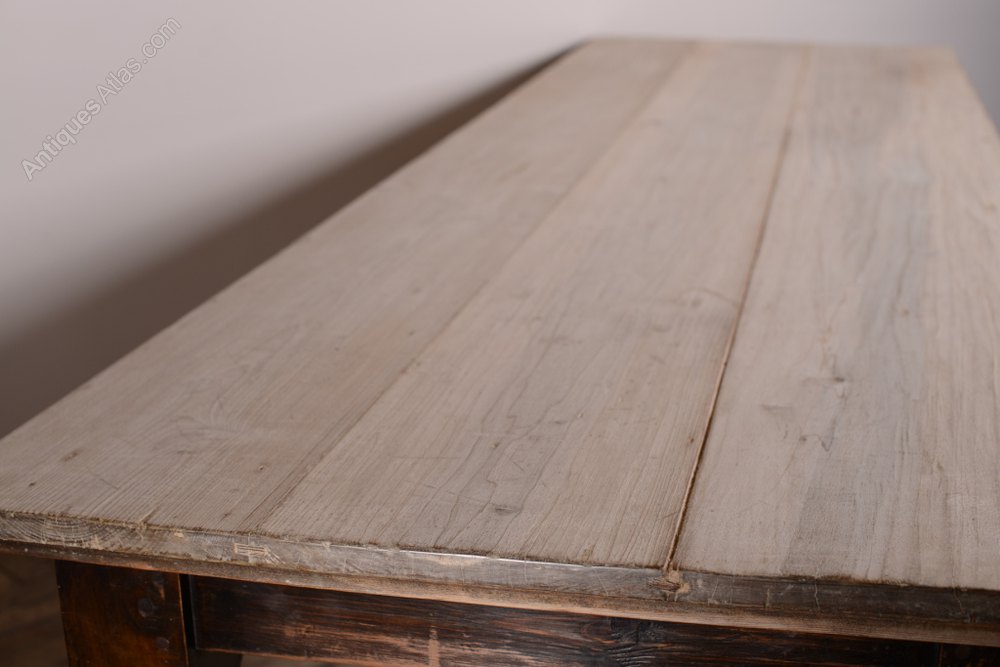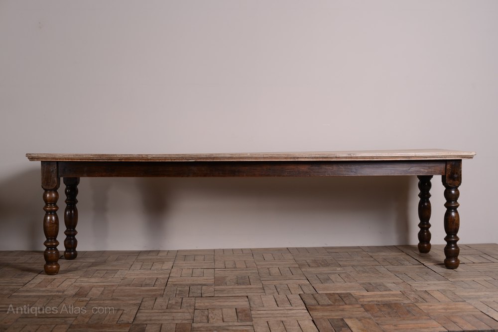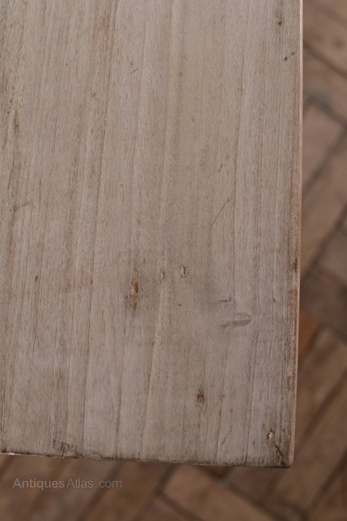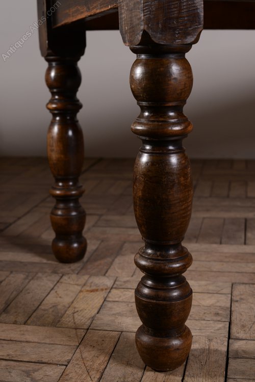 This is a good, family sized antique dining table which has four, unusually turned legs, the base is in the original finish whilst the pine top has a moulded edge and is a lovely, pale and scrubbed finish.