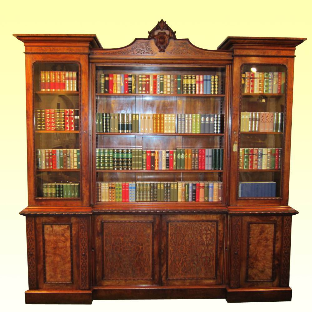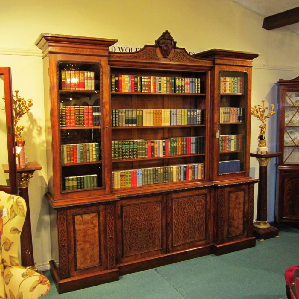 Large Figured and Burr Walnut Inverted Breakfront Antique Bookcase