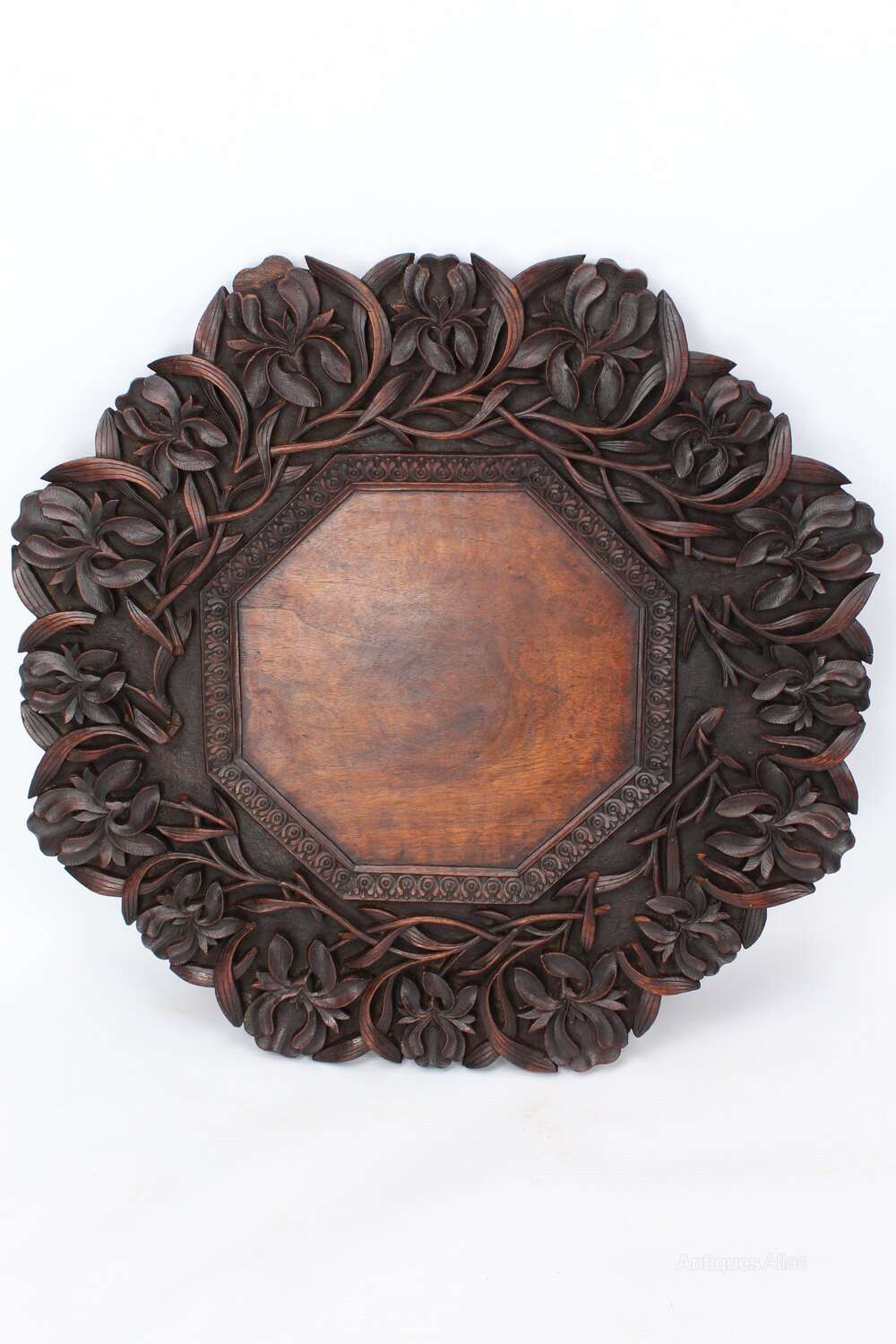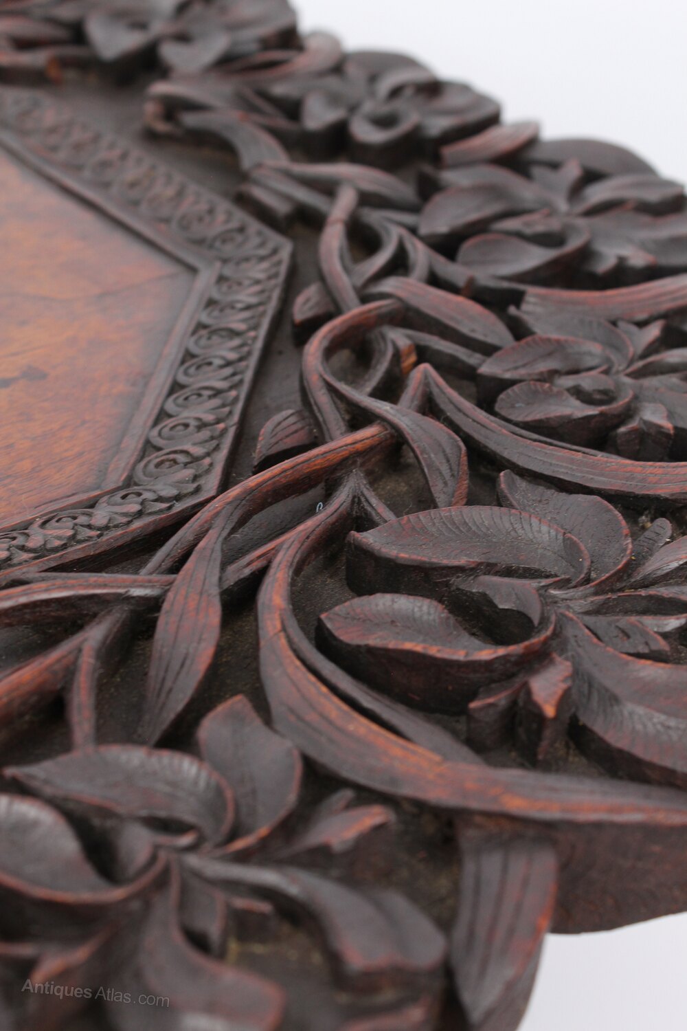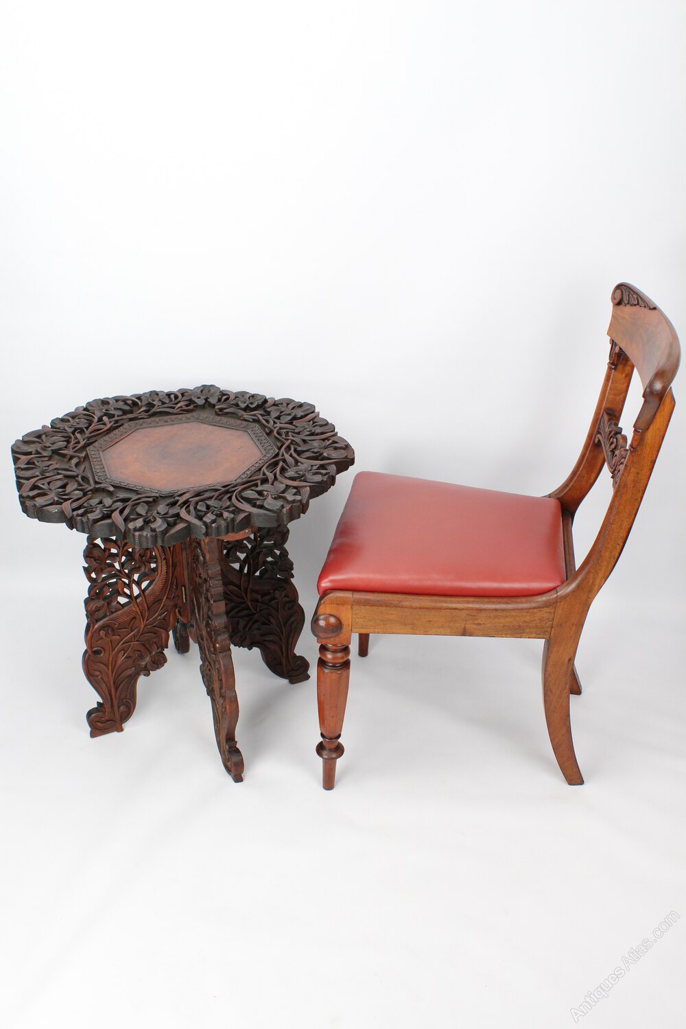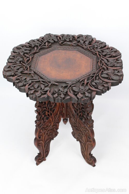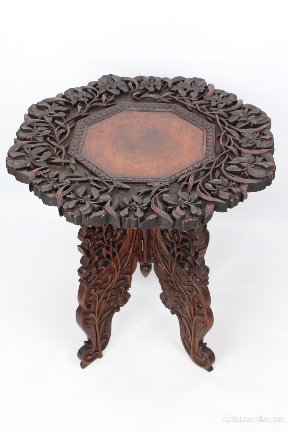 A superb antique Anglo-Indian carved side table / occasional table dating from circa 1910. Most likely from the Kashmir Region of India. The impressive top is profusely carved in deep relief with vine and foliate details to the perimeter and has plain octagonal centre. The four shaped legs offer a stable platform, and are wonderfully carved and pierced. It dismantles into folding legs and slab top for easy transportation. With deep chocolate tones and a desirable aged patina.