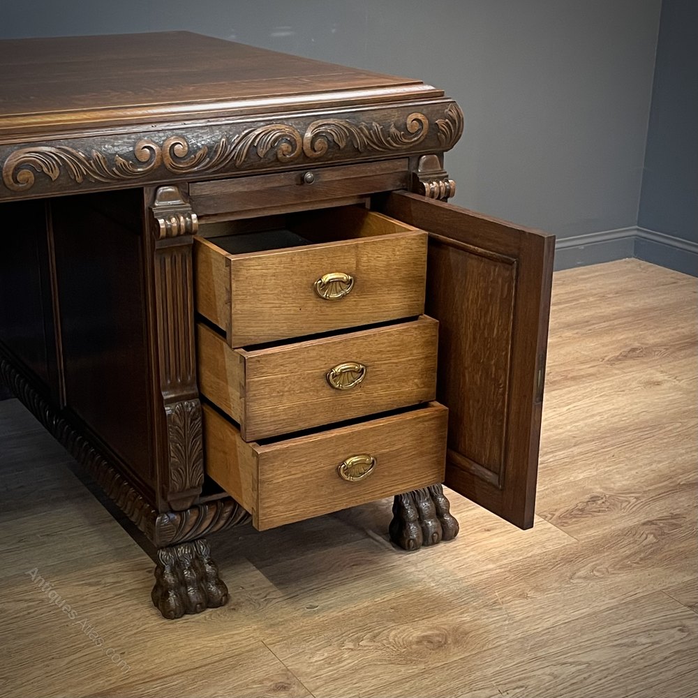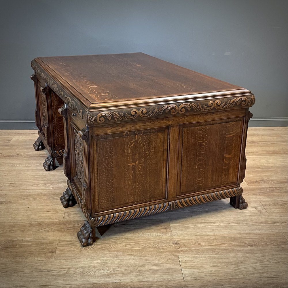 Large Antique Carved Oak Twin Pedestal Desk