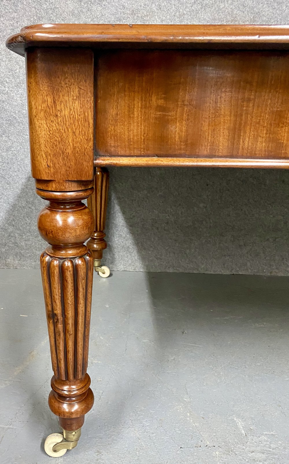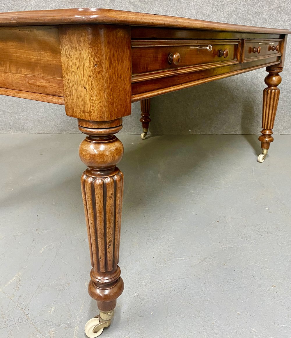 A very good large 19th century mahogany writing table / desk. The mahogany moulded edge top having a black leather writing surface with gold and blind tooling. The front having 2 mahogany lined drawers with applied mouldings and turned pulls with working brass locks and keys. The table is raised on very good fluted legs with brass and white porcelain cup casters. The whole in very good condition and ready to grace any home or office. Dimensions:- Height…29’’/ 73.5cm. Width…59.5’’/ 151cm. Depth…39’’/ 99cm. Delivery to most of U.K mainland £75.00