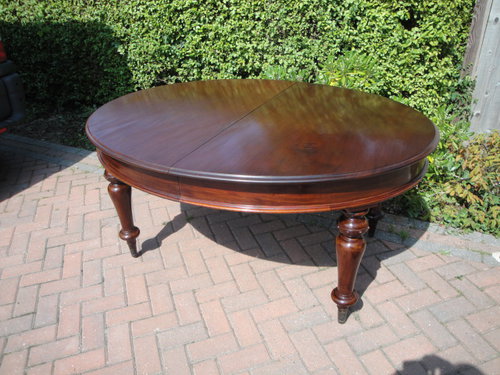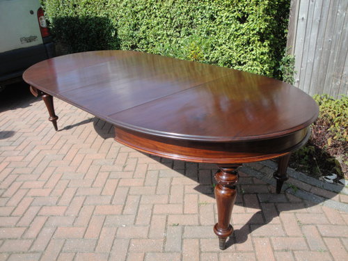 Offered for sale is this superb quality Victorian mahogany telescopic dining table extending from approximately 61" x 49" to 108" x 49" with two leaves, a comfortable 10/12 seater. The oval top has moulded edge above turned supports and standing on brass castors. This is a Victorian pull out dining table with a superior extending mechanism that works very smoothly and comes complete with "piano" clips. The table has been cleaned and sympathetically repolished whilst retaining its original character. It is in excellent showroom condition and dates to about 1870.