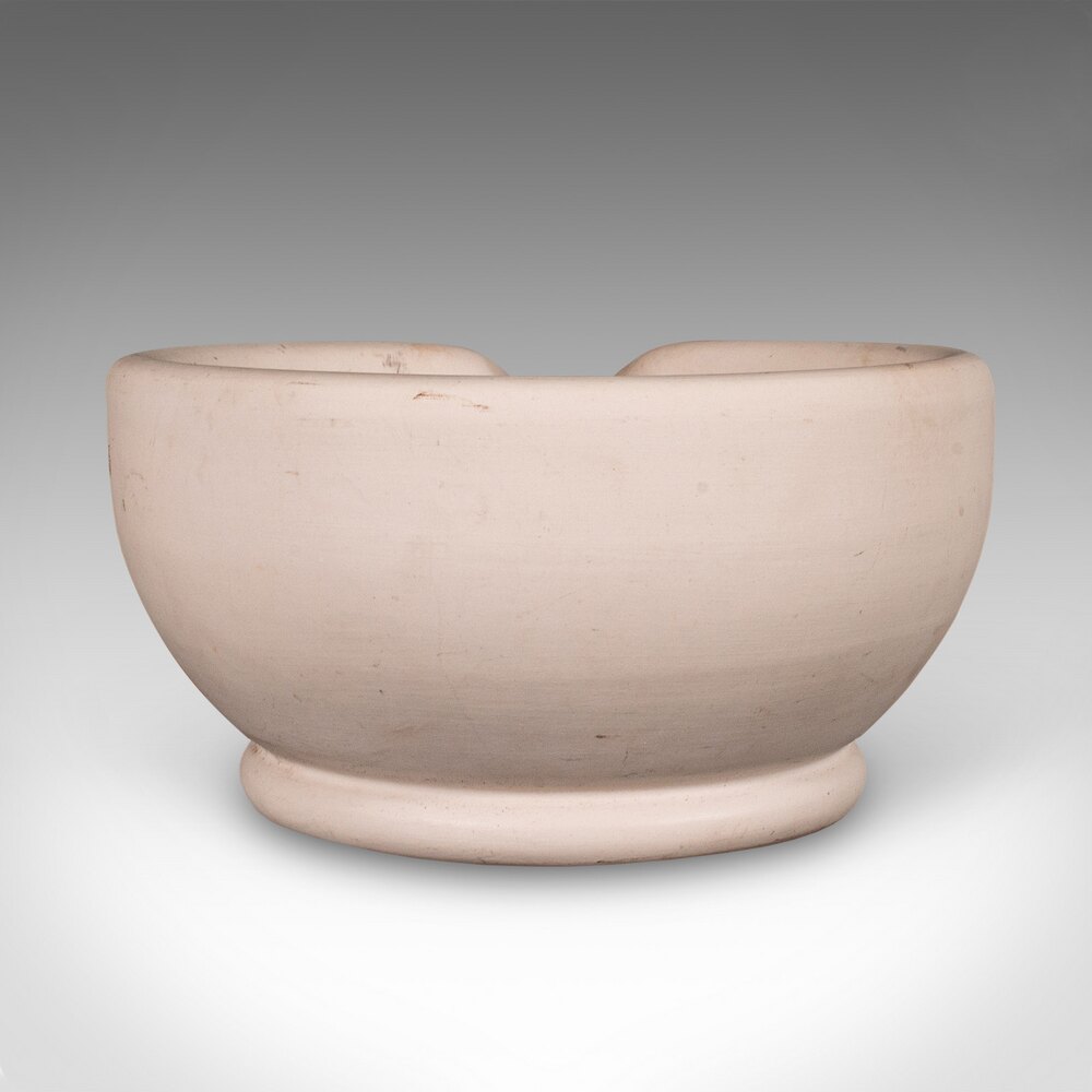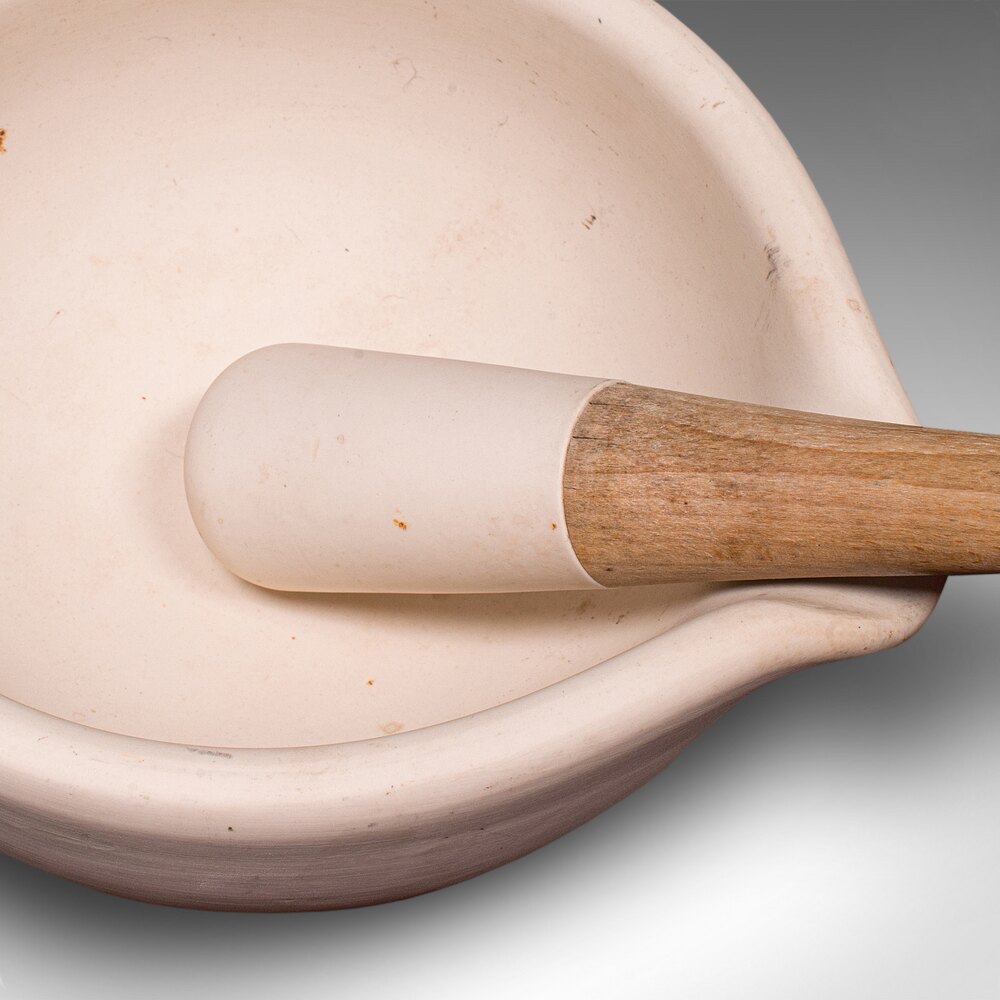 This is a large antique mortar & pestle. An English, apothecary or country kitchen grinding set in ceramic and beech, dating to the Edwardian period, circa 1910.