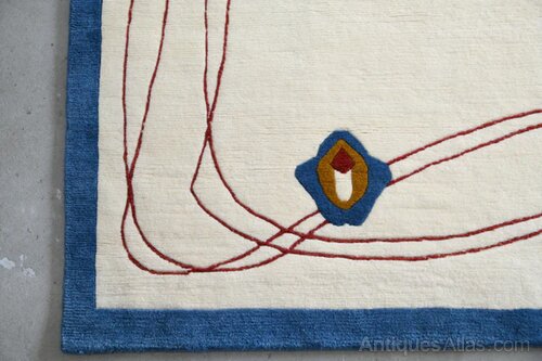 Large Art Nouveau Style Wool Rug. Late 20th Century good quality deep pile wool rug with cream ground and red, blue and gold border of stylised flowers.