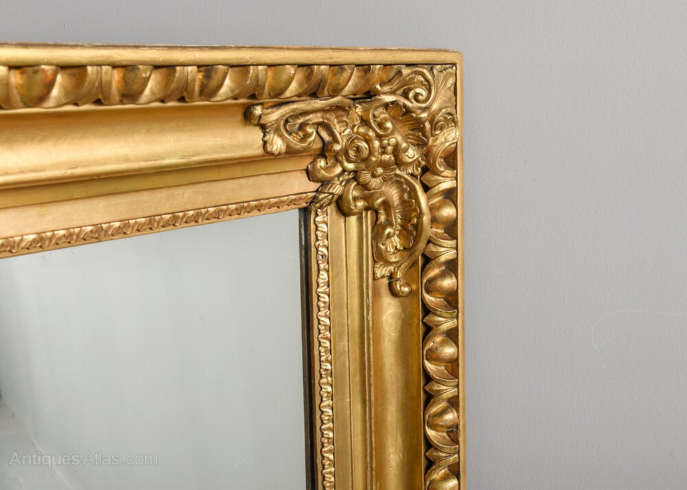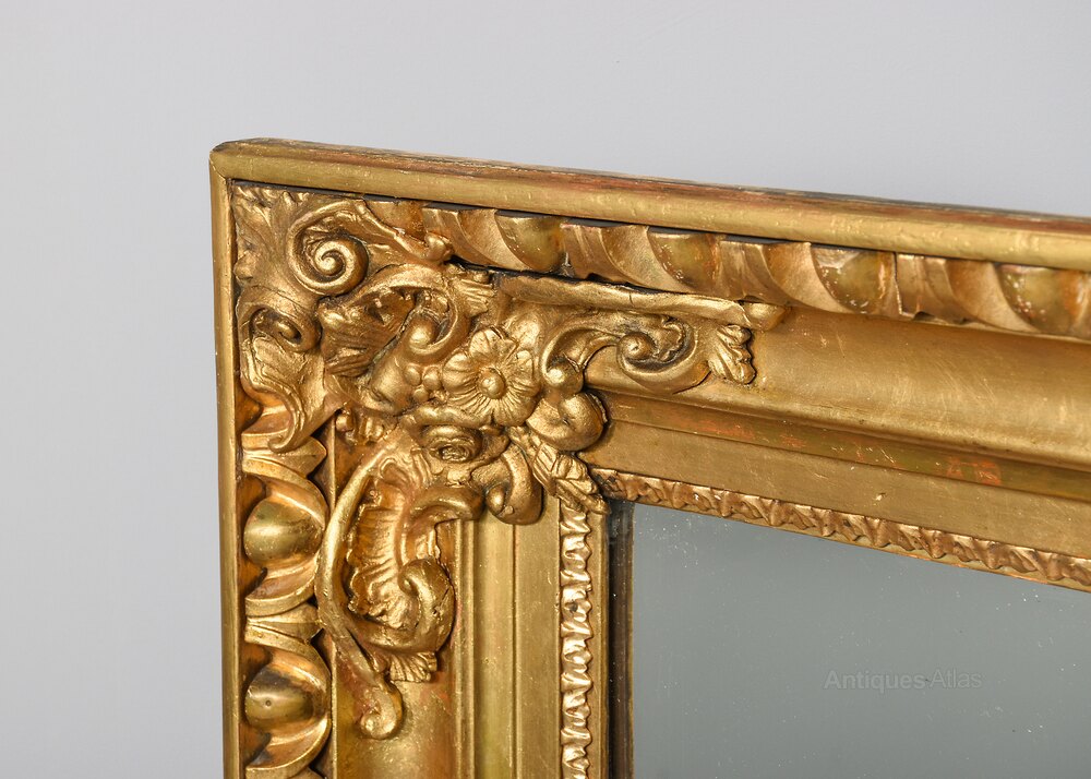 Circa 1870. A large carved and gilded rectangular mirror, retaining its original mirror plate in a simple carved and gilded slip with concave sections to the outside, each of the corners with a profusely carved foliate section including flower heads, leaves and C and S scrolls, the outer edge of the frame with a stylish carved wooden and gilded decoration, unusually the sides of the frame are chamfered in solid wood. Can be hung portrait or landscape.