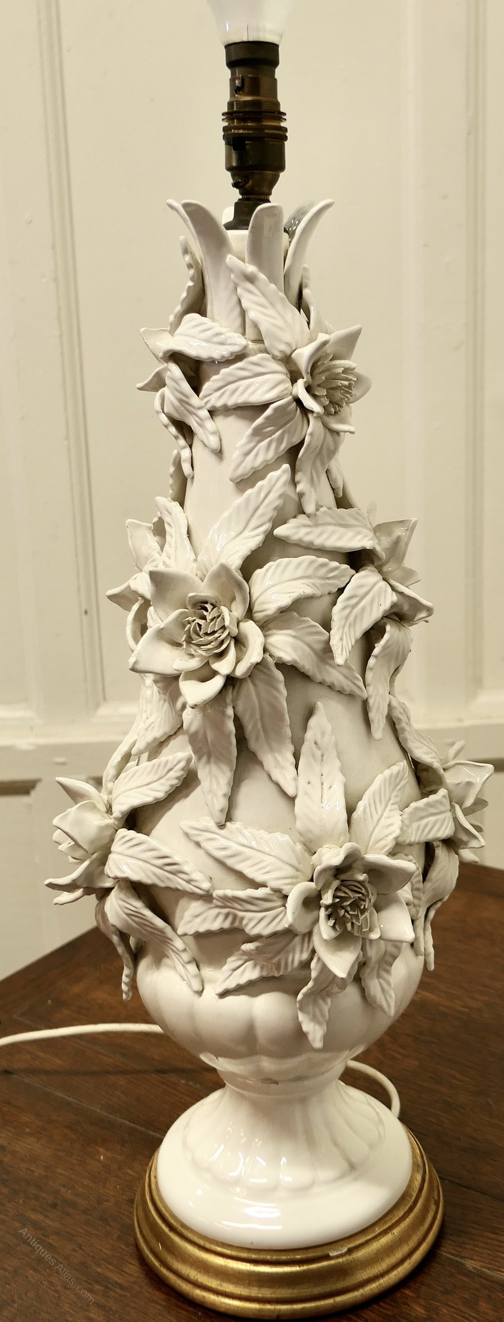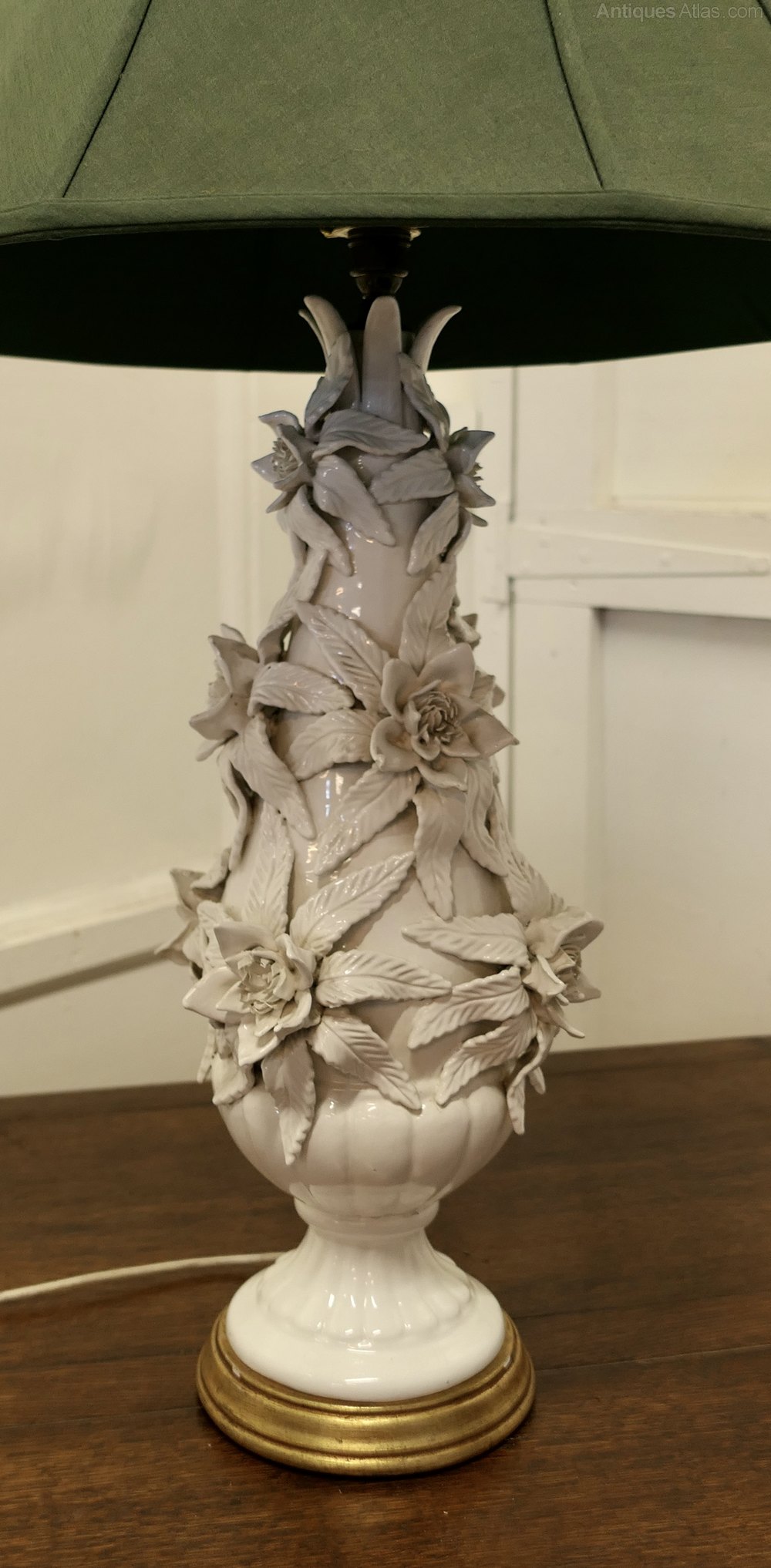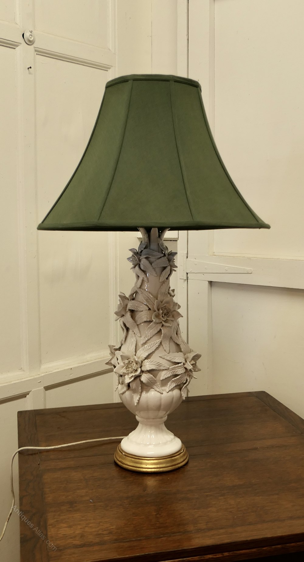 This is a good large lamp, decorated with large porcelain flowers, set on a Giltwood base, the lamp has a large green lampshade which can be included if wished