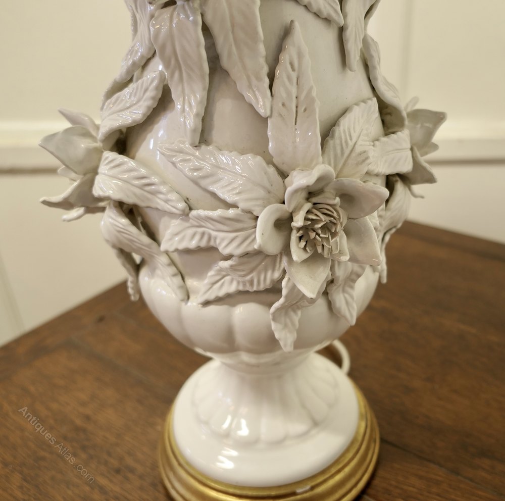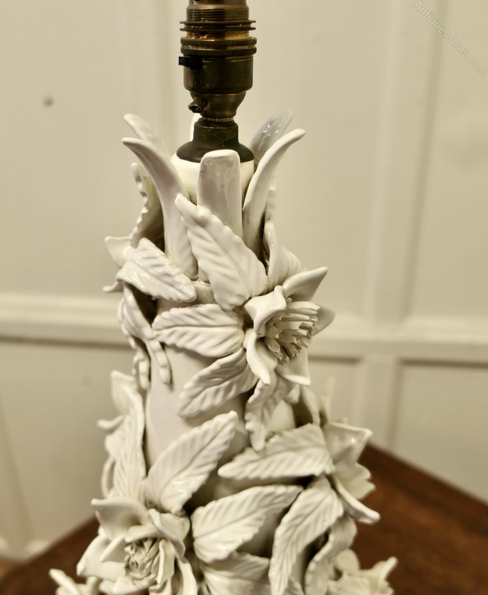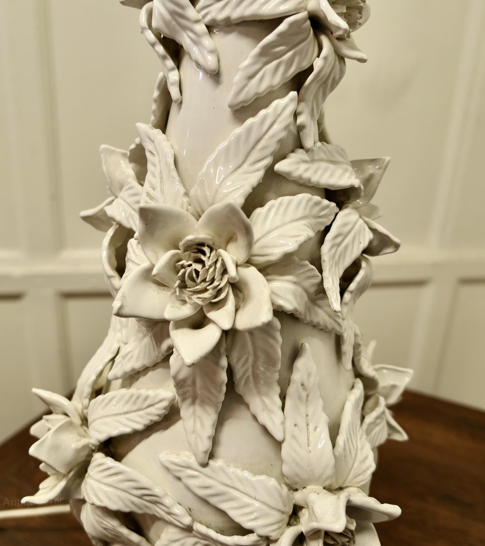 This is a good large lamp, decorated with large porcelain flowers, set on a Giltwood base, the lamp has a large green lampshade which can be included if wished