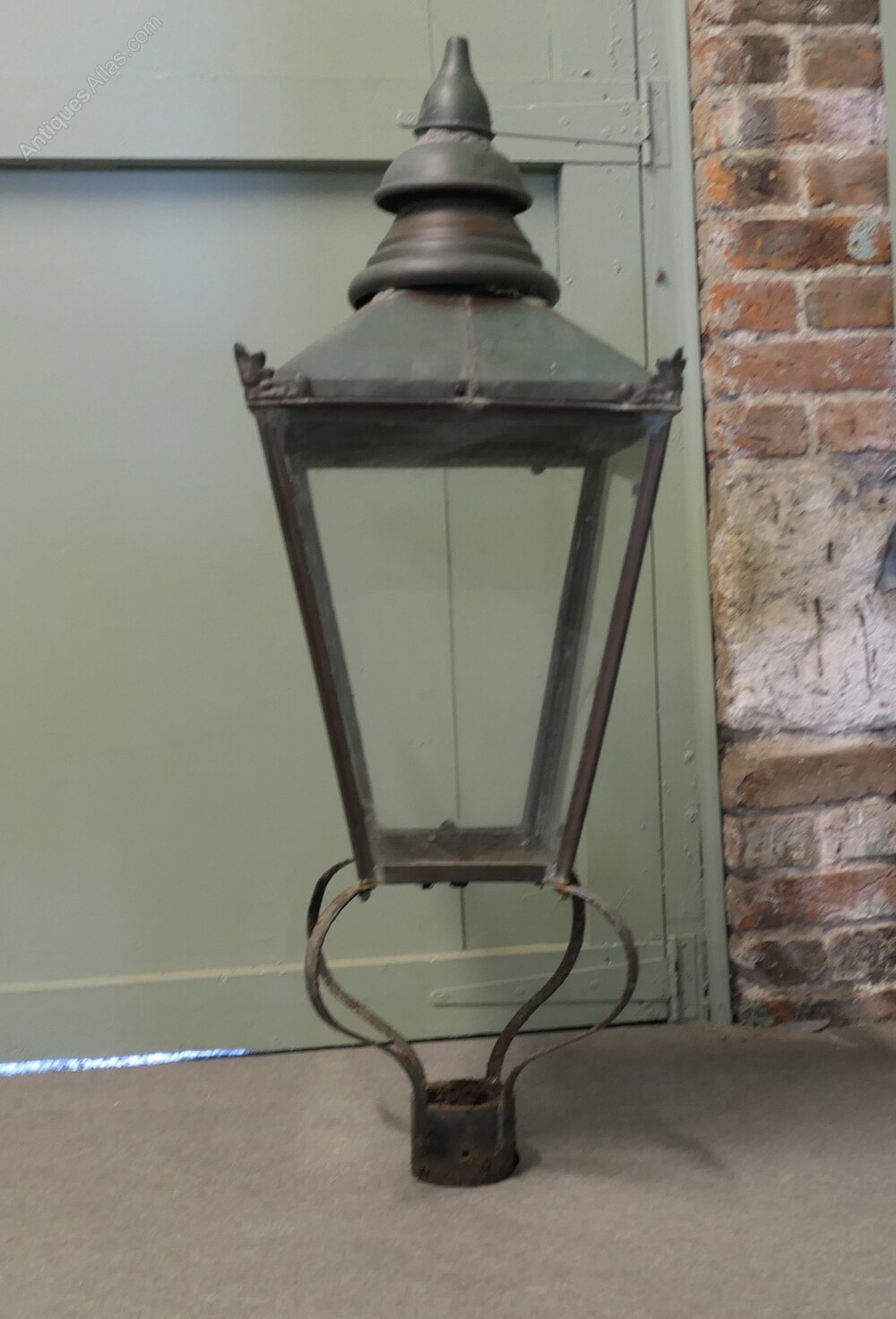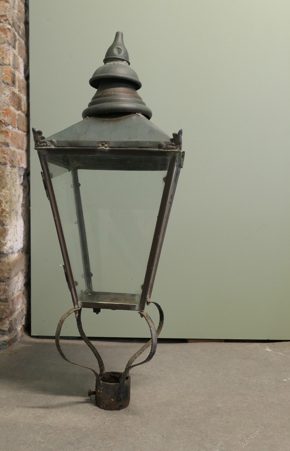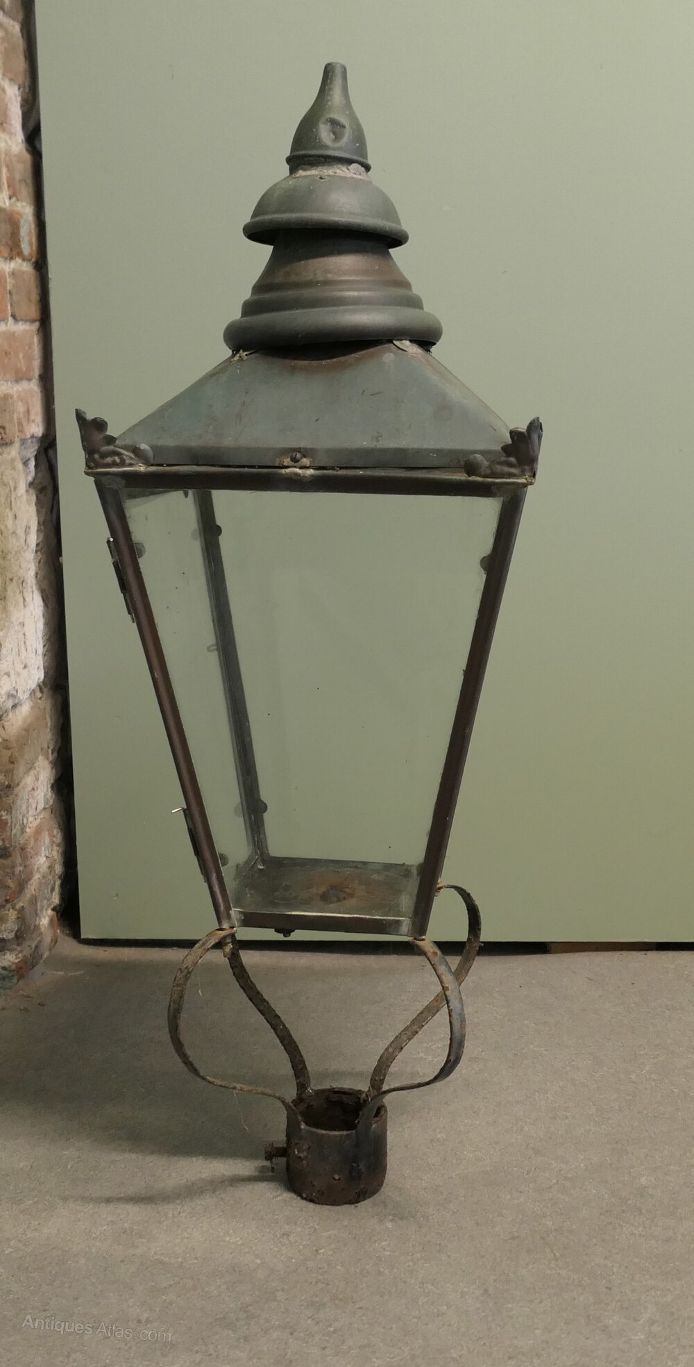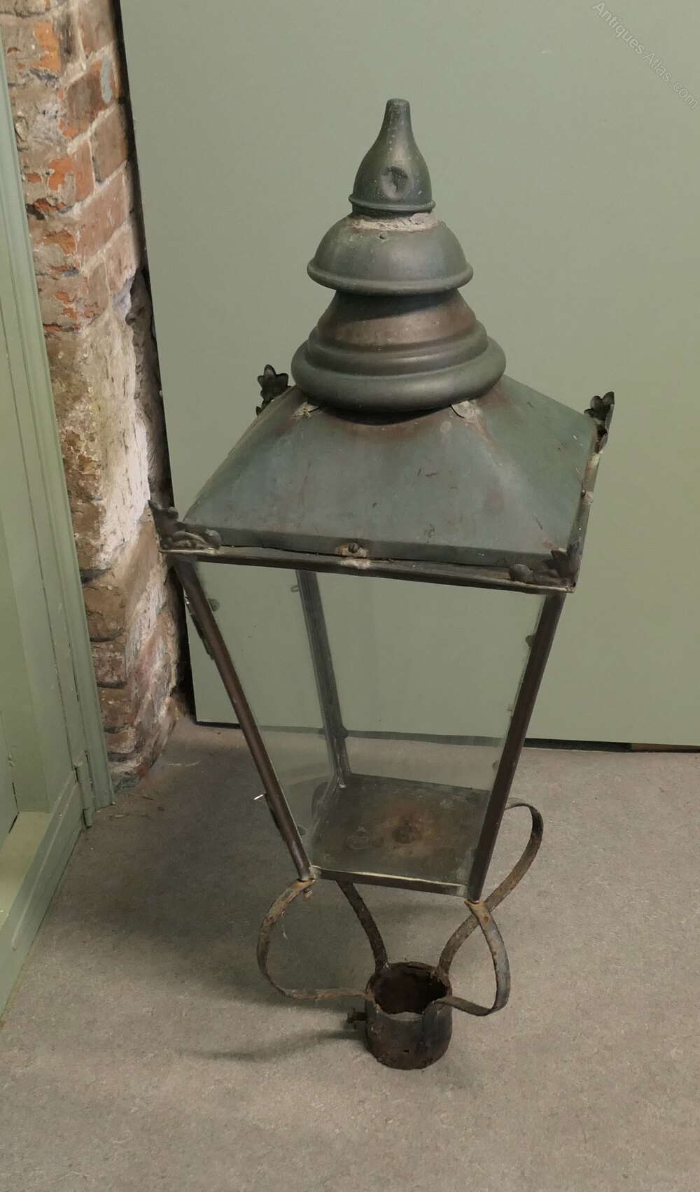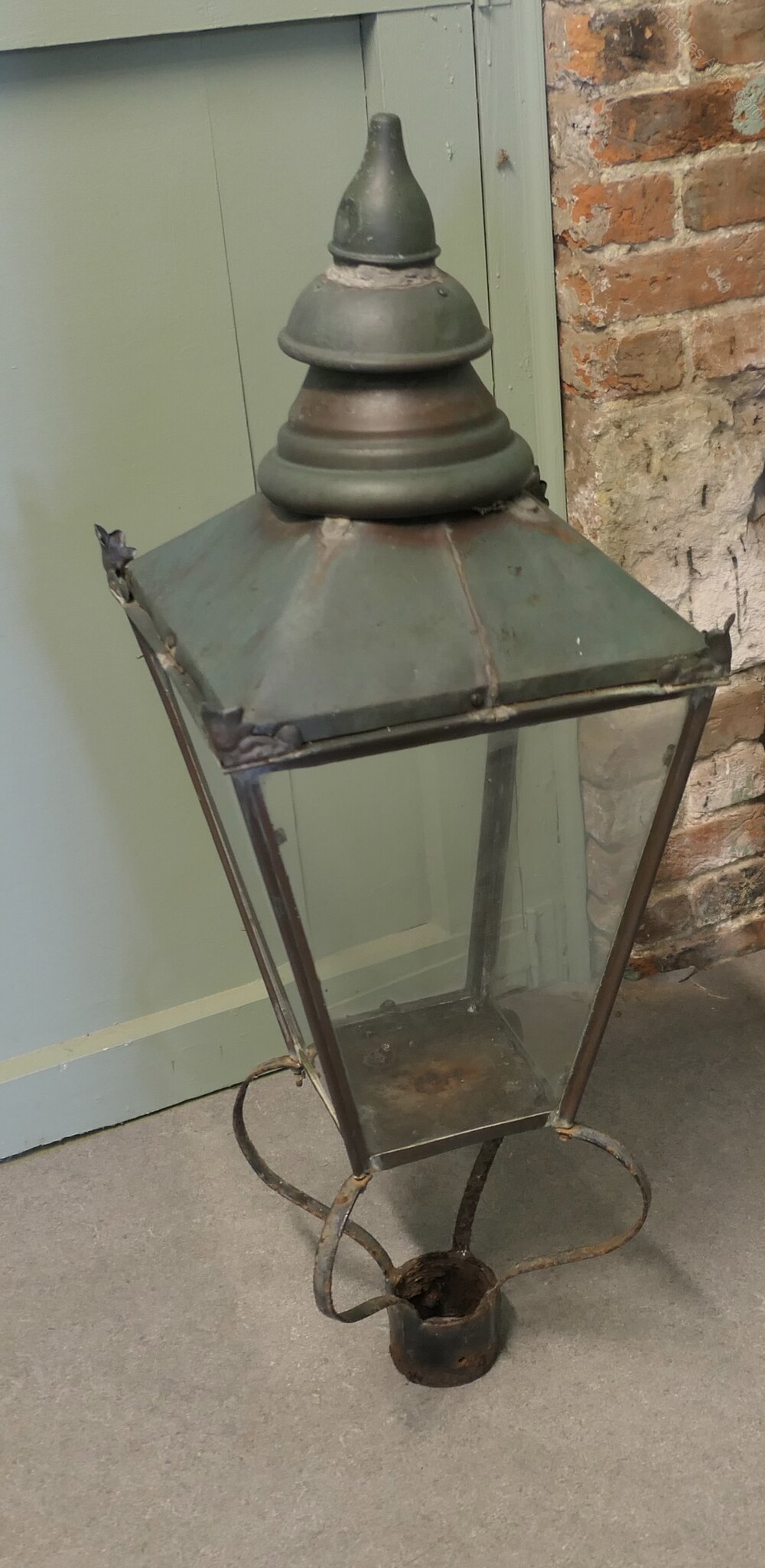 This is a superb large piece the glass sides are all good, there is a small crack not moving in the floor of the light, the copper is beautifully weathered and has verdigris colouring, the internal wiring of the lamp has been removed and it will need to be replaced