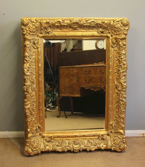 Large Decorative Gilt Overmantle Wall Mirror This large decorative Bevelled edge gilt wall mirror it is set in a large decorative gilt wide frame. The mirror is in good condition and a very decorative piece.