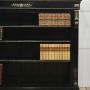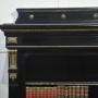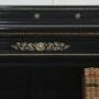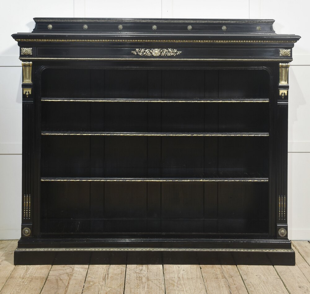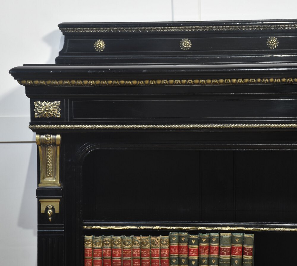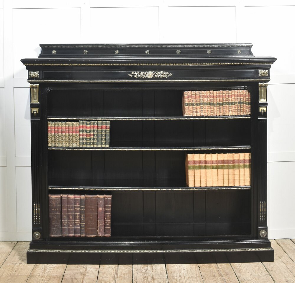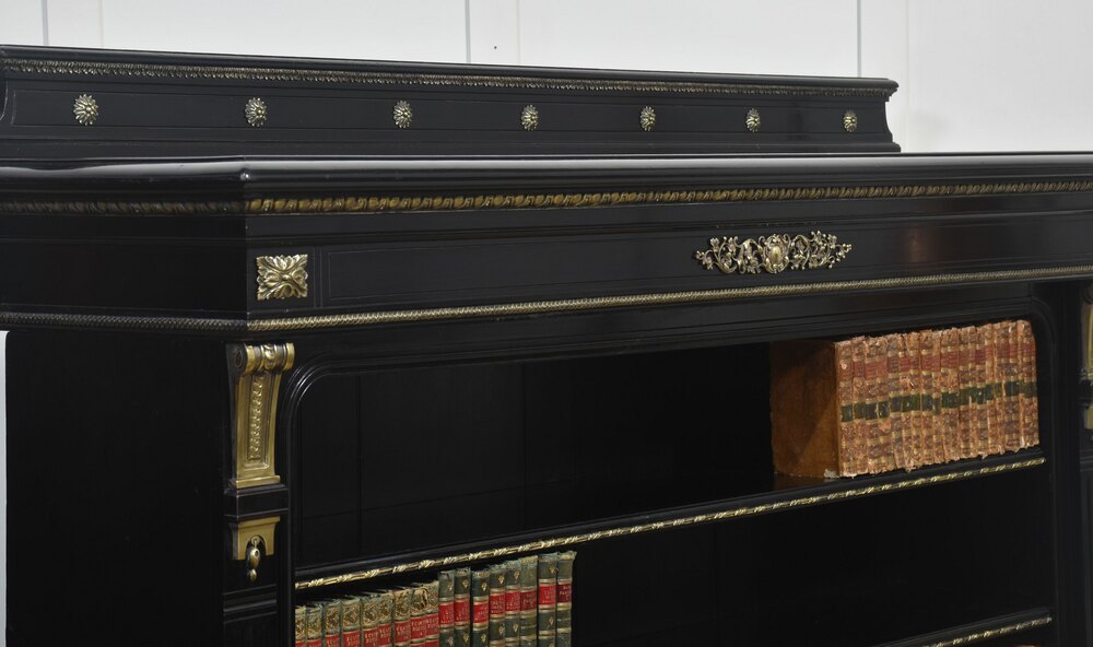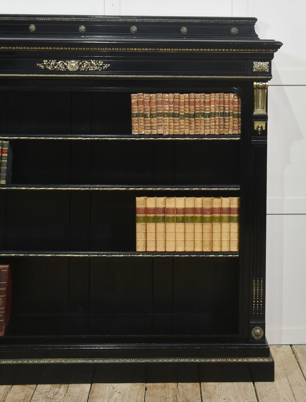 19th Century ebonised and gilt mounted open bookcase having foliage gilt decoration throughout. The quarter gallery top with moulded edge, over an ornate gilt egg and floral scrolling design mounted on the frieze. Above three adjustable shelves, flanked by fluted columns with scrolling foliated mounts. All raised up on plinth base.