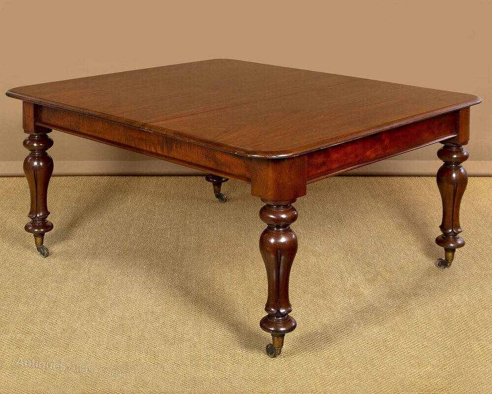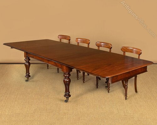 Impressive mid 19th.c. mahogany extending dining table by Pratt & Prince of Bradford Yorkshire c.1860. The top extending on a corkscrew mechanism and telescopic frame from a comfortable six seater table (length 59") to a maximum length of 128", with four additional leaves to seat 10 - 14 people. Solid mahogany top with a moulded edge and rounded corners. Good turned and segmented tulip legs with the original brass collared castors. Paper maker's label to the frame. Some old marks to the top, generally very good colour and condition, cleaned and waxed in our workshops. Winding handle supplied.