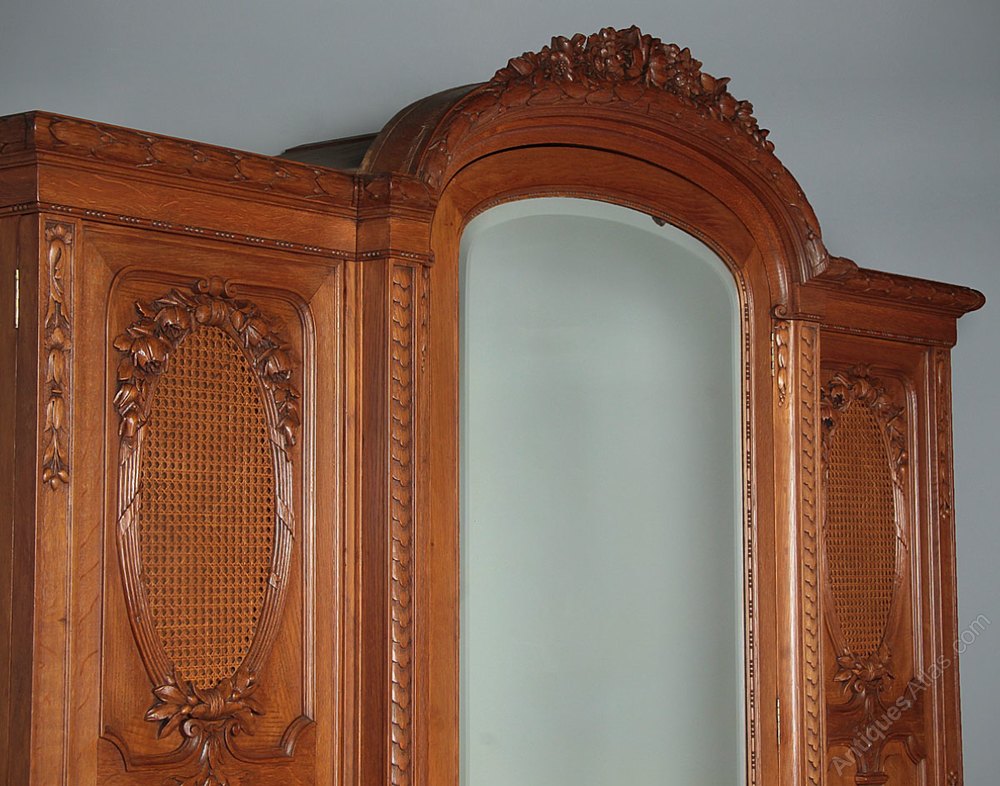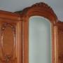 Superb quality large French oak wardrobe c.1910. Breakfronted, the deeper central section with brass rail for full length hanging plus a single drawer in the base. Flanked on both sides with shallower sections with four adjustable shelves in each side. Standing 7’8″ tall with a superbly carved cornice with flower garland and laurel leaf detail over the original arch top dressing mirror to the outside of the centre door. Unusual bergere panels to the side doors with further exceptionally well carved detail and original gilded escutcheon plates. Oak panelled sides and a carved plinth raised on short fluted legs. Excellent colour and condition, cleaned and waxed in our workshops. Keys supplied.