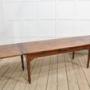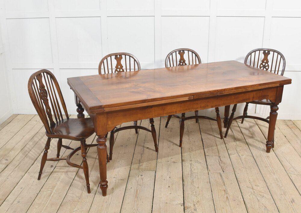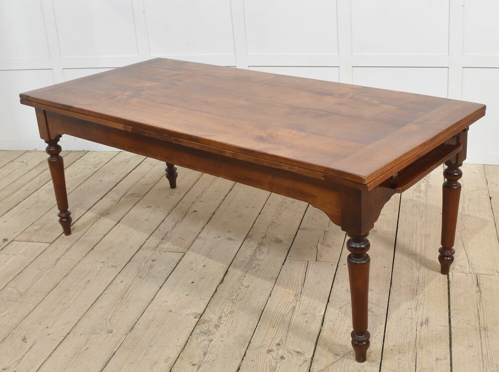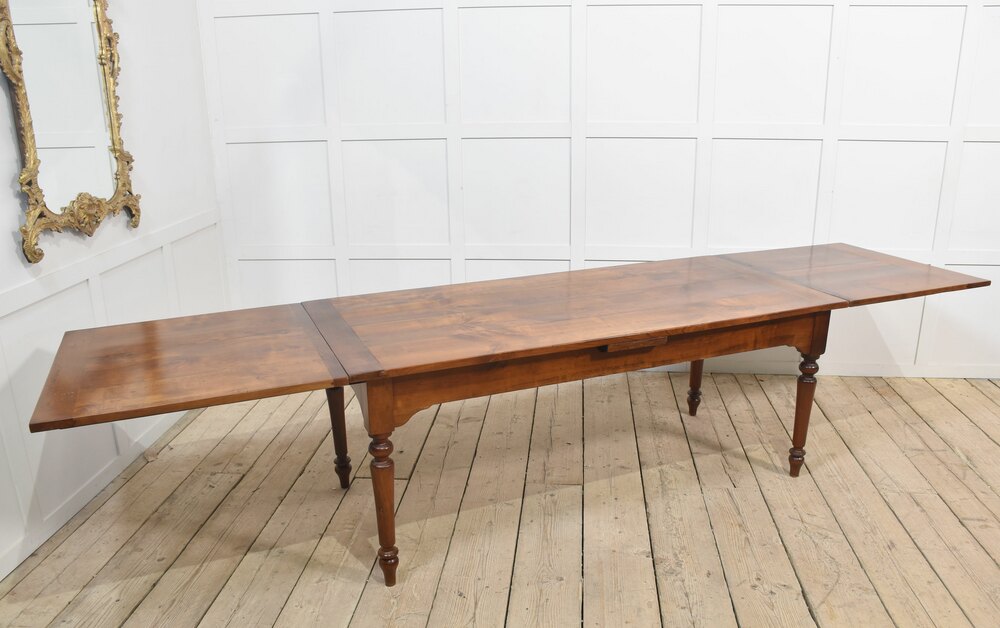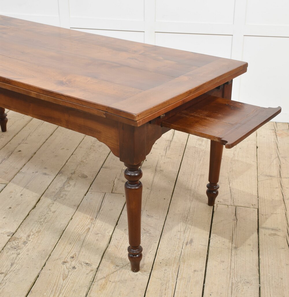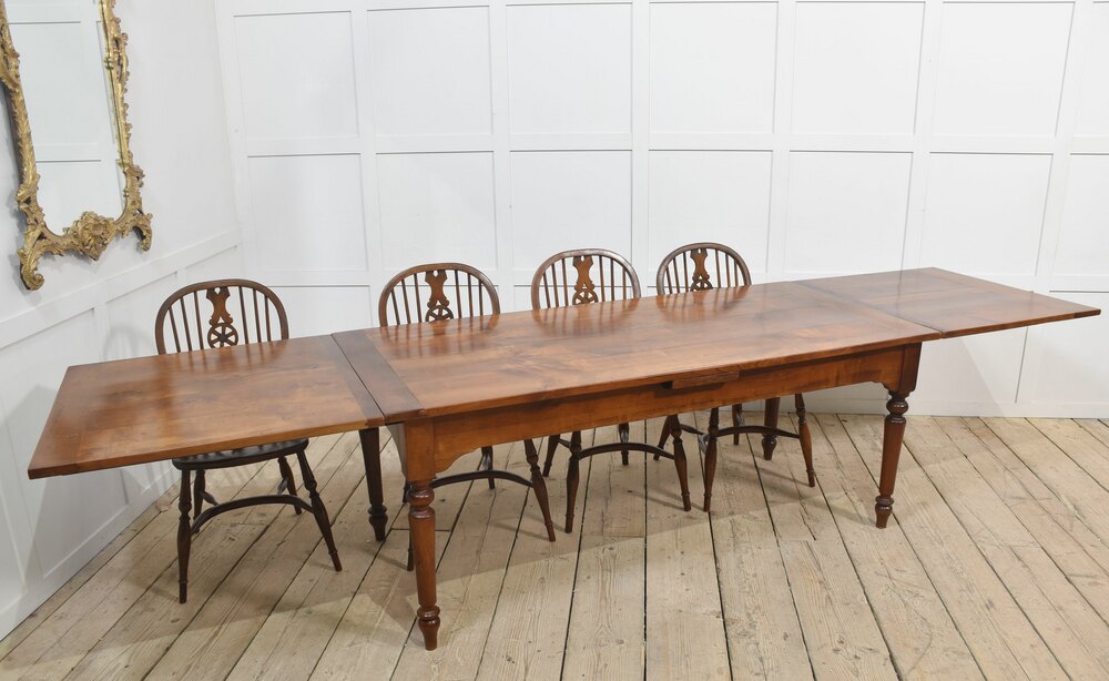 Very large farmhouse table. The rectangular top with pull out ends to the block freeze fitted with cheese slide all raised up on turned tapering legs. Will seat 12 people.
