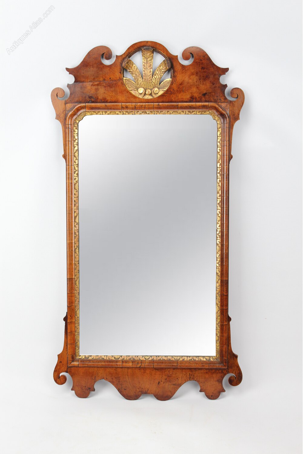 A large and impressive antique George II walnut fretwork or Chippendale mirror dating from circa 1750. A really attractive and large mid 18th Century mirror with extremely Well-figured cross-grained walnut fretwork frame, surmounted by a decorative pierced and gilt wood Prince of Wales feathers. The aged bevelled rectangular mirror plate within a moulded surround and carved parcel gilt inner slip. Beautifully mellowed it boasts a lovely warm patina and surface, the gilding also remains in relatively good condition and has a lovely old lustre to it, a nice large sized mirror, this is a real statement piece. There are a few minor old breaks and repairs to the frame, having been well repaired.