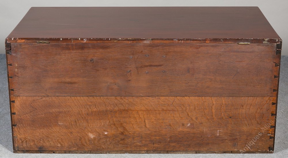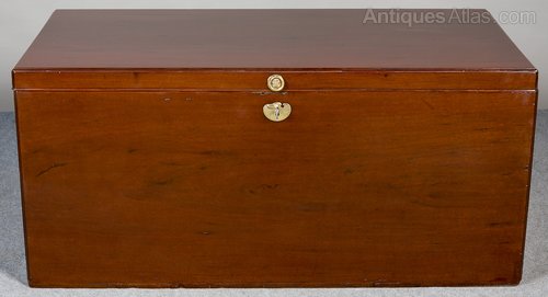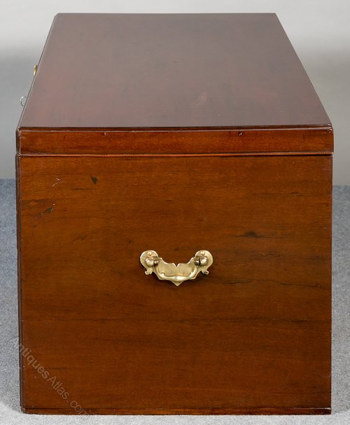 A very heavy late 18th. C. mahogany Silver chest/coffer/trunk/blanket box with original brass carrying handles and escutcheon. The circular brass lid lifting handle is a later replacement. Original working steel lock with key. Good overall condition. Size- Width...47''...120cm. Depth...23''...58.5cm. Height... 22''...56cm. Delivery to most of U.K. £55.
