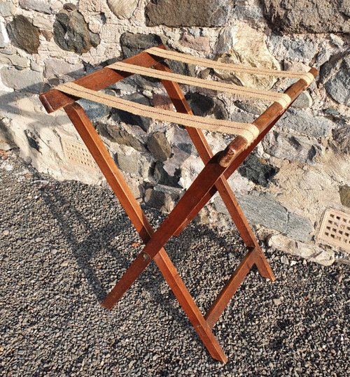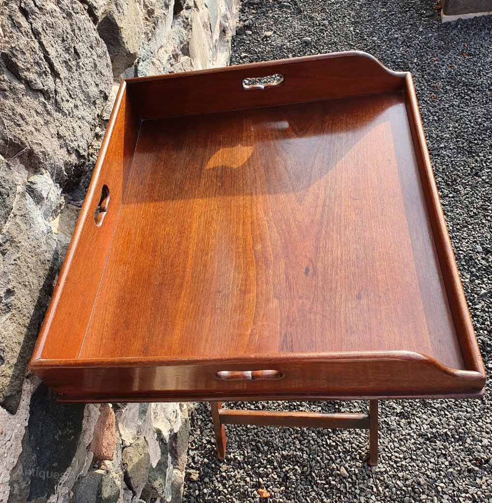 Large size early 19th century Georgian solid mahogany oblong butlers tray with original folding stand. The tray is of dovetailed construction with nice shape handle cut outs. The tray is in good condition for its age and is a lovely colour with original patination. Unusually large size. Please note the height can be reduced by lengthening the webbing on the stand if required