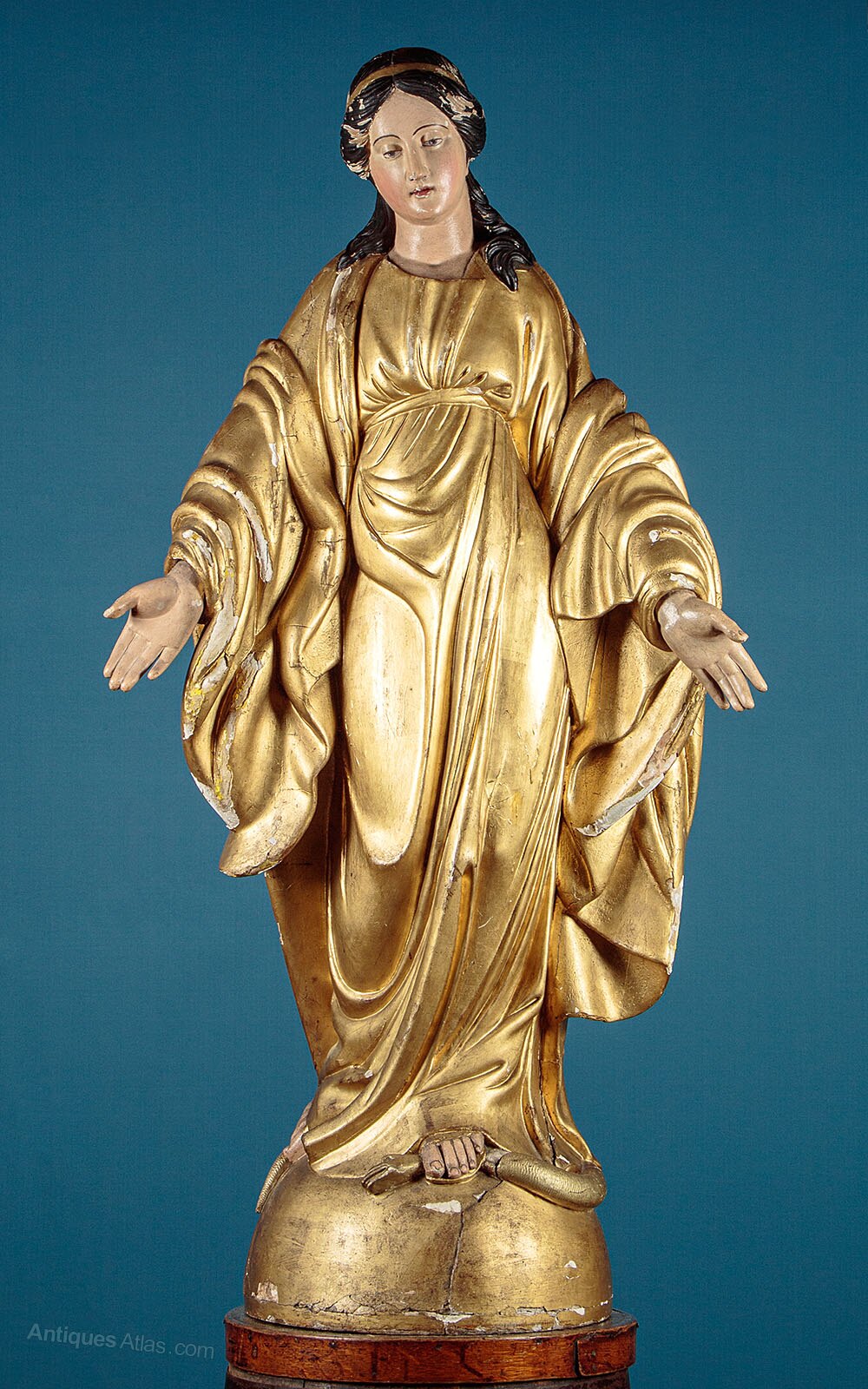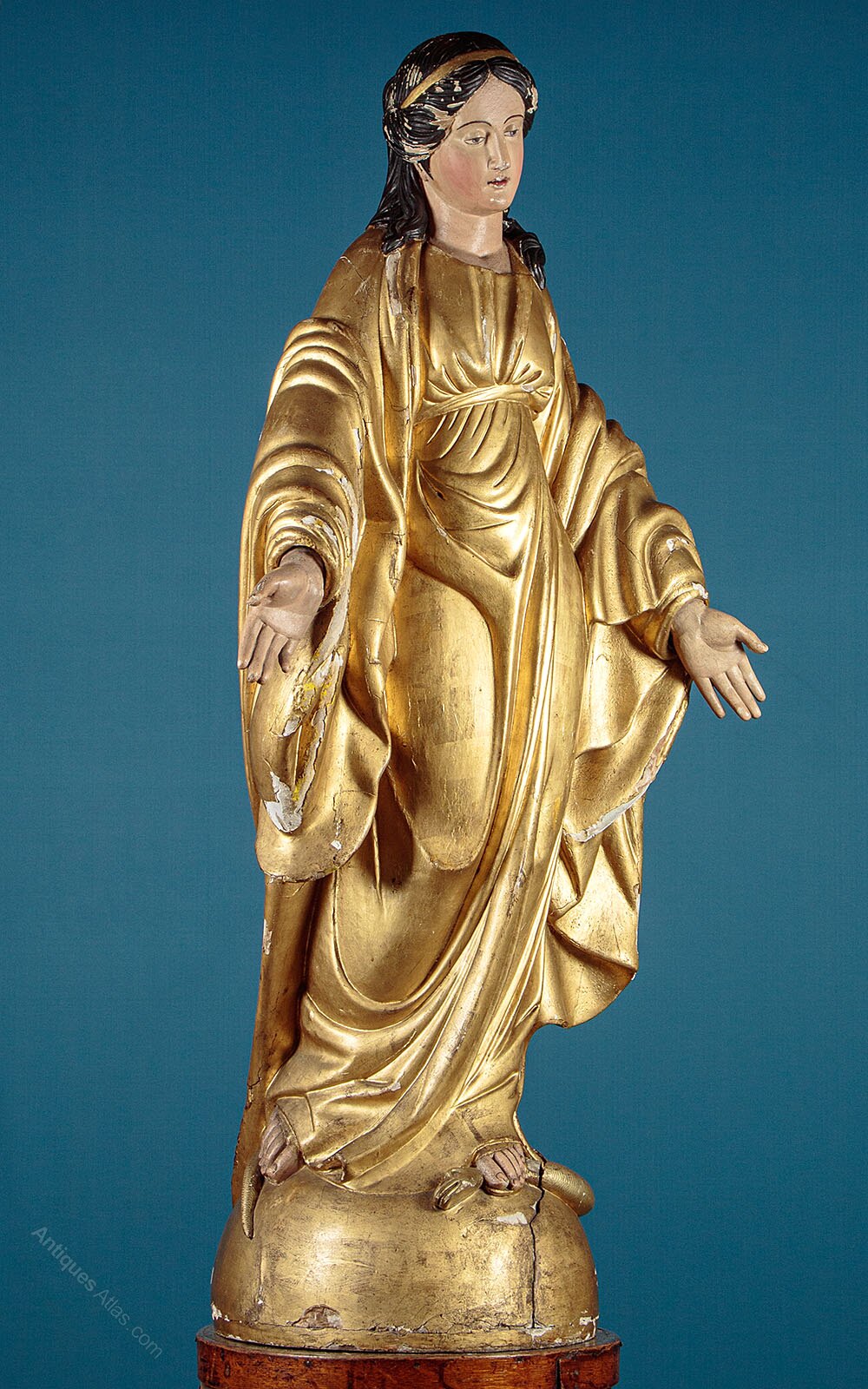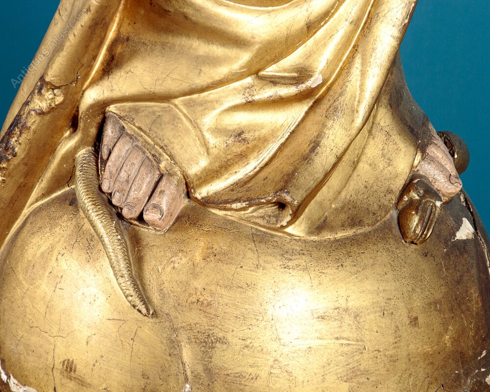 Large early 19th.c. French giltwood figure of the Virgin Mary c.1820. Standing 51" tall, carved wood with polychrome, gesso and gilded finish. Full length figure of Mary with her arms open in compassion and blessing, stood on a half globe (14" diameter at the base) representing the earth and crushing below her feet a serpent representing sin and the devil. Original paintwork to the hair face and hands, original gold leaf gilding to the robes and base. Presented as found with some wear to the face and missing some areas of gilding and plaster, revealing the carved wood below.