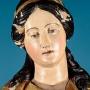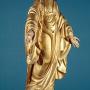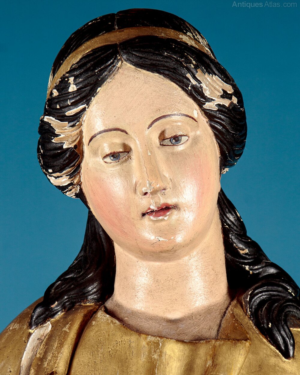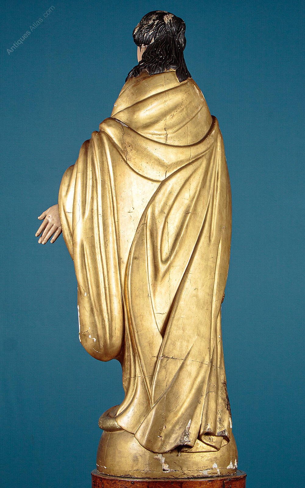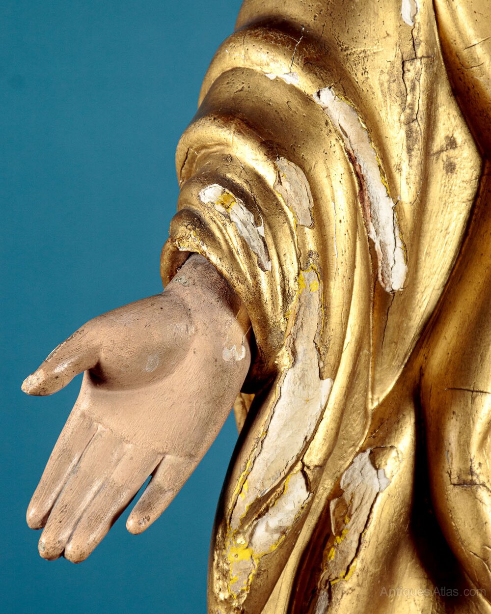 Large early 19th.c. French giltwood figure of the Virgin Mary c.1820. Standing 51" tall, carved wood with polychrome, gesso and gilded finish. Full length figure of Mary with her arms open in compassion and blessing, stood on a half globe (14" diameter at the base) representing the earth and crushing below her feet a serpent representing sin and the devil. Original paintwork to the hair face and hands, original gold leaf gilding to the robes and base. Presented as found with some wear to the face and missing some areas of gilding and plaster, revealing the carved wood below.