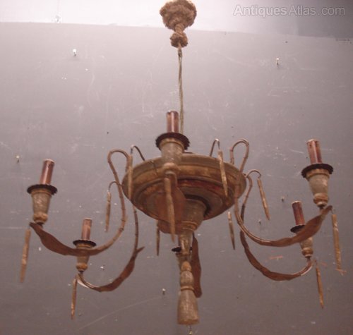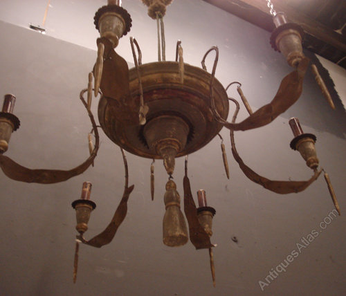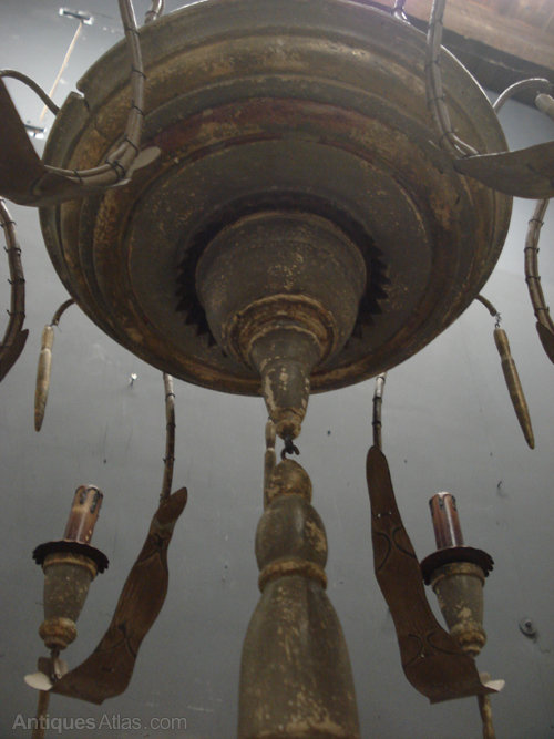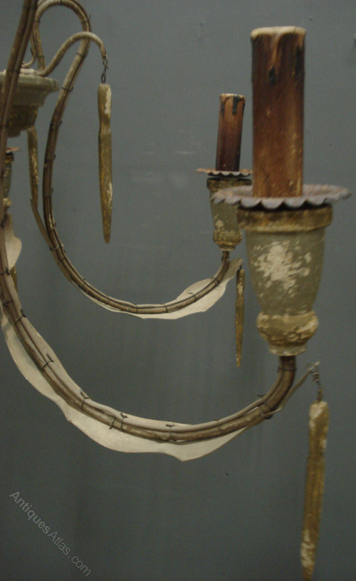 Ref 4992 - Large Italian 6 arm spider chandelier. Wood and metal finished in original worn green and gilt paint. Not wired. Circa 1920.
