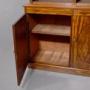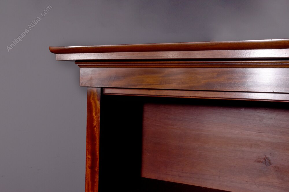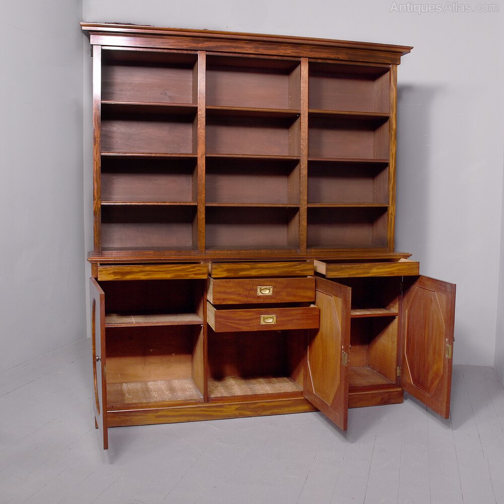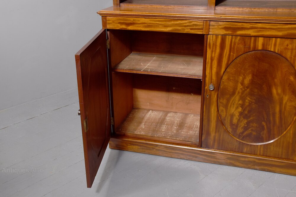 Circa 1850. An early Victorian mahogany three section open bookcase, the top with stylish moulded cornice with a simple beaded frieze, the top section with three open sections, each with three adjustable shelves separated by flat pilasters, the base with three concealed drawers in the frieze and three doors with oval flame mahogany panels with and cast brass knob handles, inside a variations including drawers and shelving, resting on an enclosed mahogany plinth.