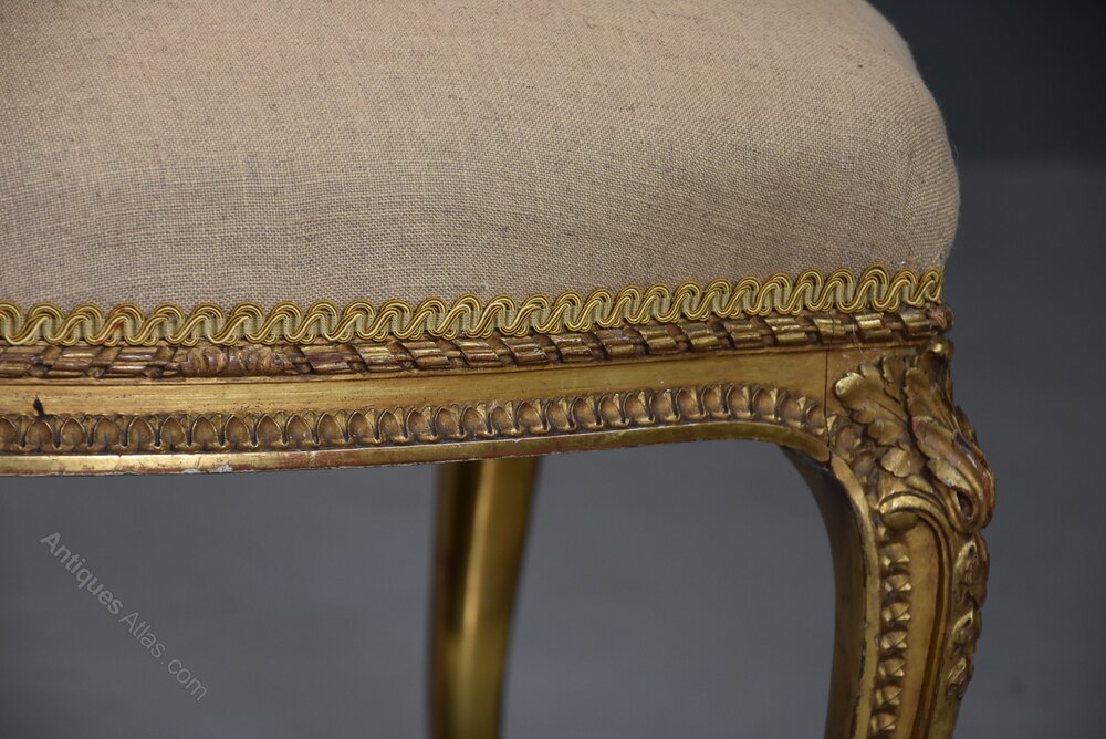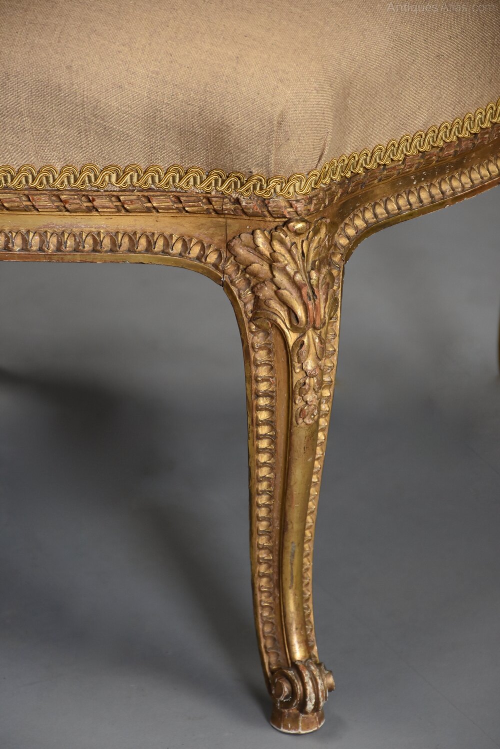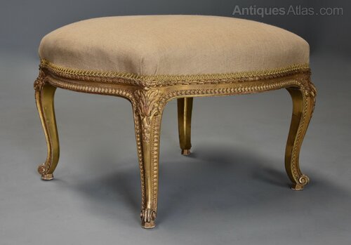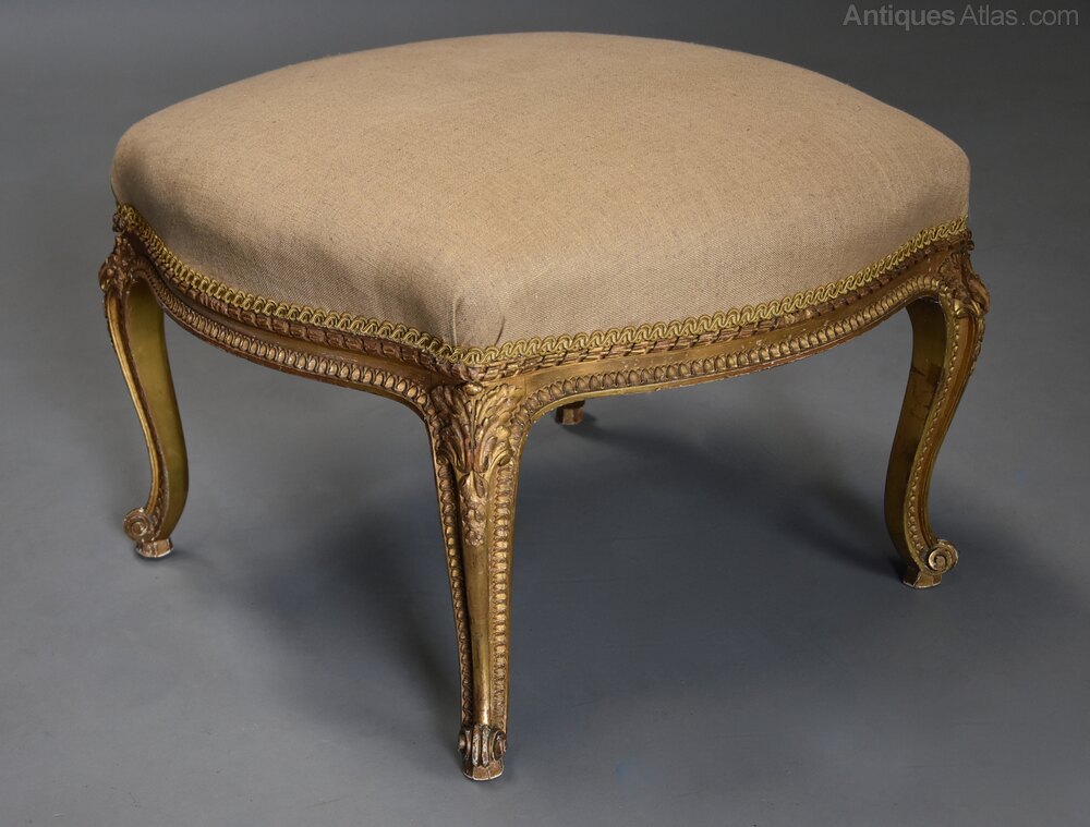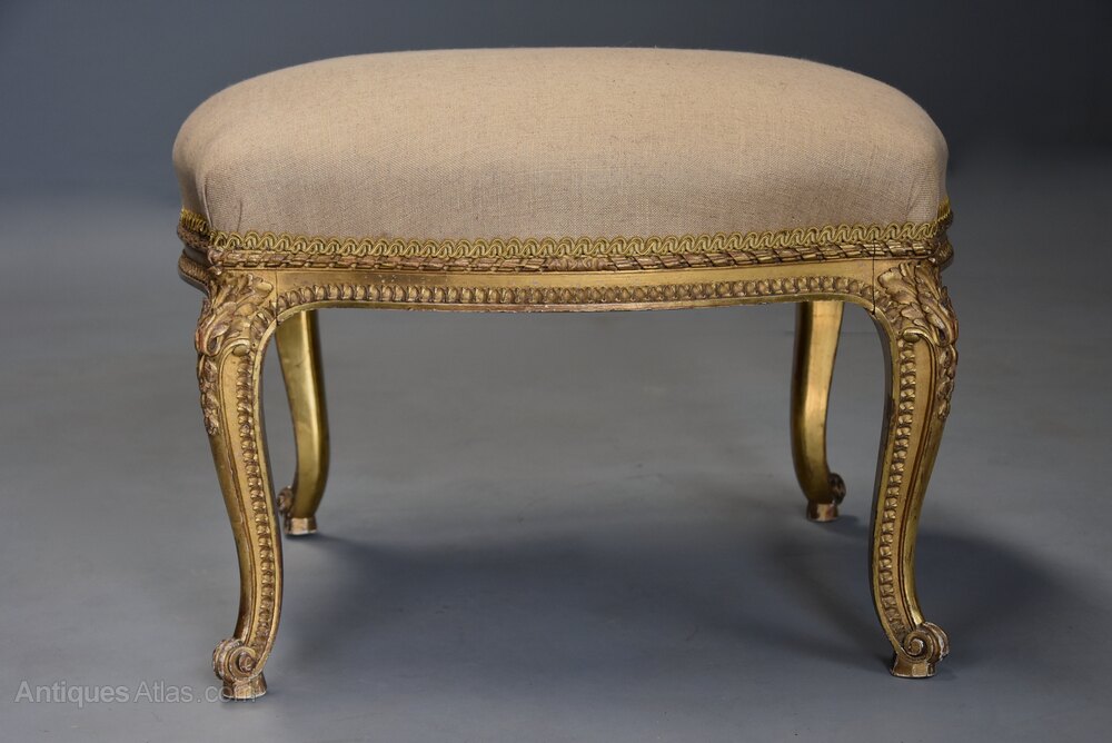 A large mid 19th century (circa 1860) French carved giltwood stool with shaped upholstered seat.