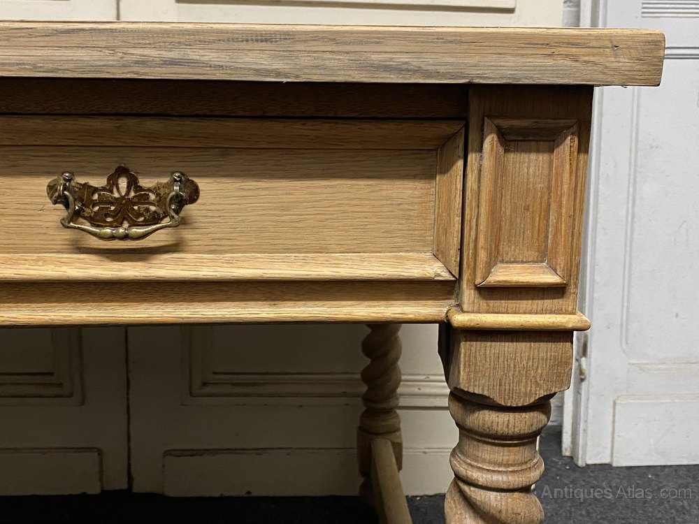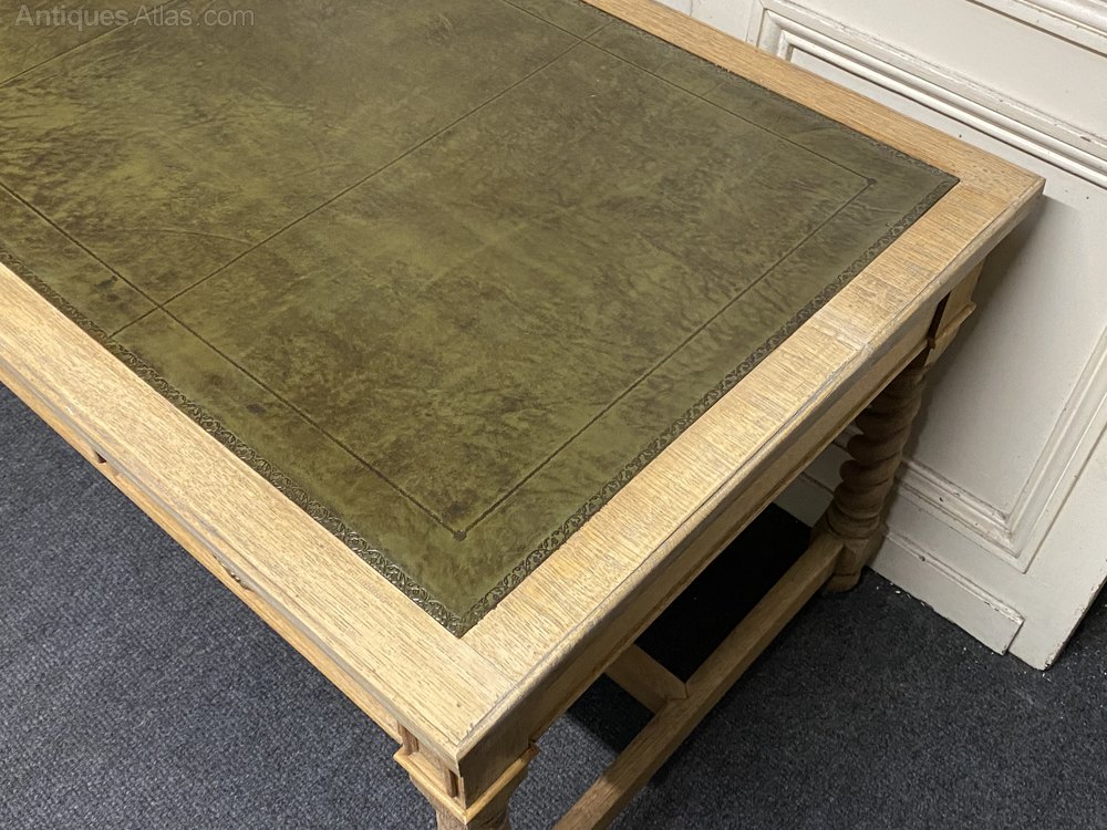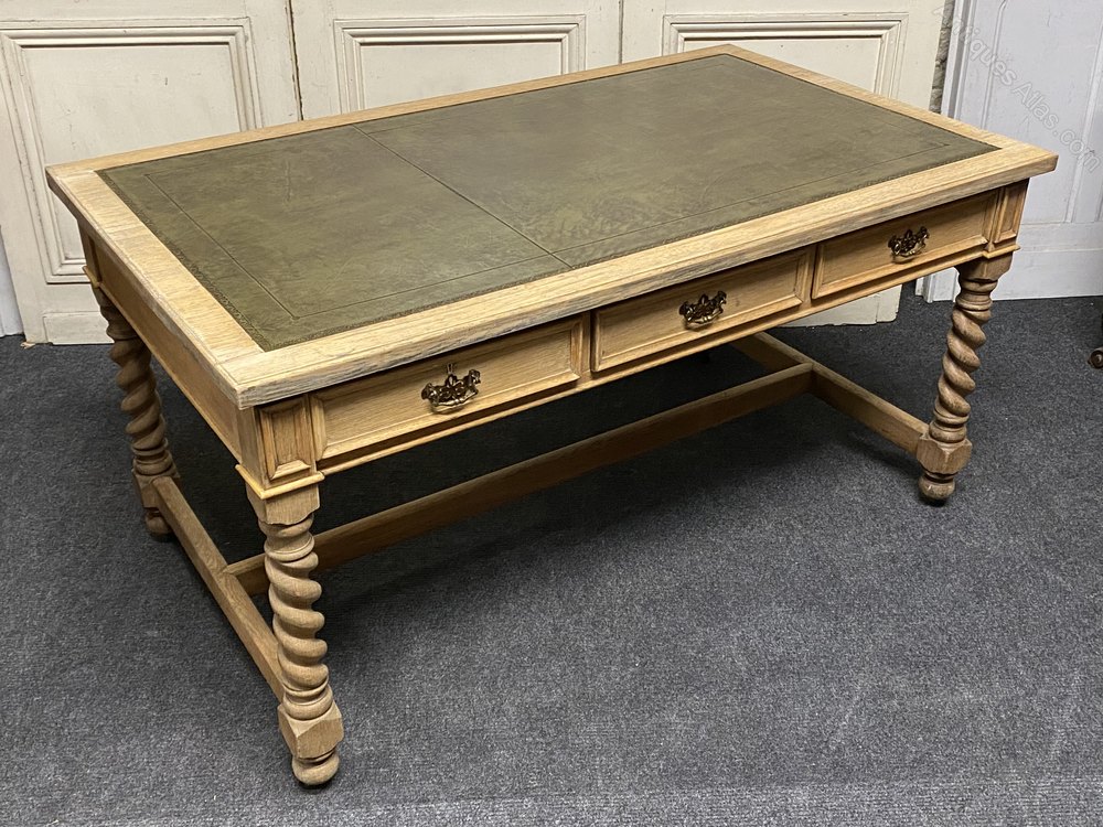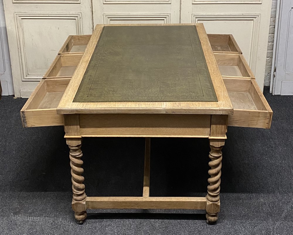 A superb Oak Writing Table or Desk have 6 drawers. Dating to around 1900 and of good solid construction with barley twist legs. We have stripped and bleached it and added a new leather. The drawers all run smoothly fitted with brass handles.