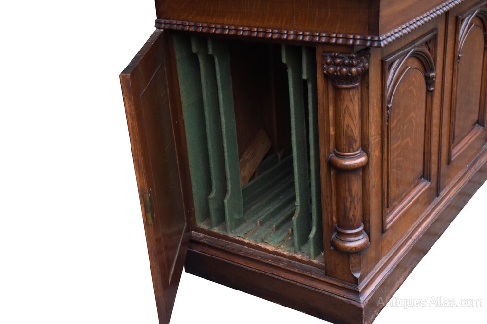 Circa 1860. An early Victorian quarter-sawn oak dining Table, the D-shaped table with wonderful figured oak, stylish fore-edge and simple frieze, with the original four leaves, the undercarriage in mahogany with brass brackets and a double winding mechanism, resting on five removable bulbous, turned and fluted finishing with a large brass cup and original brass castors. In addition there is a stylish leaf holder with a high shelved back with a pierced three-quarter gallery supported on carved uprights with a panel back, with a large polished surface, two drawers in the frieze and three panels in the front with gothic tracery, flanked by a pair of pilasters similar to the top, with a door on one side for putting the leaves into the leaf holder, all on an enclosed oak plinth