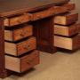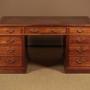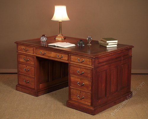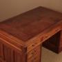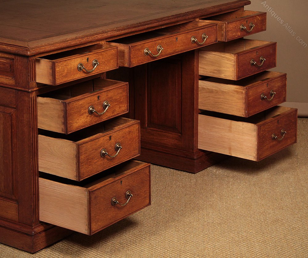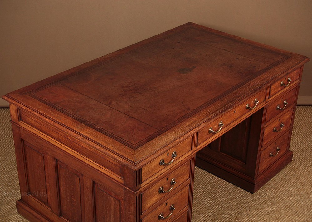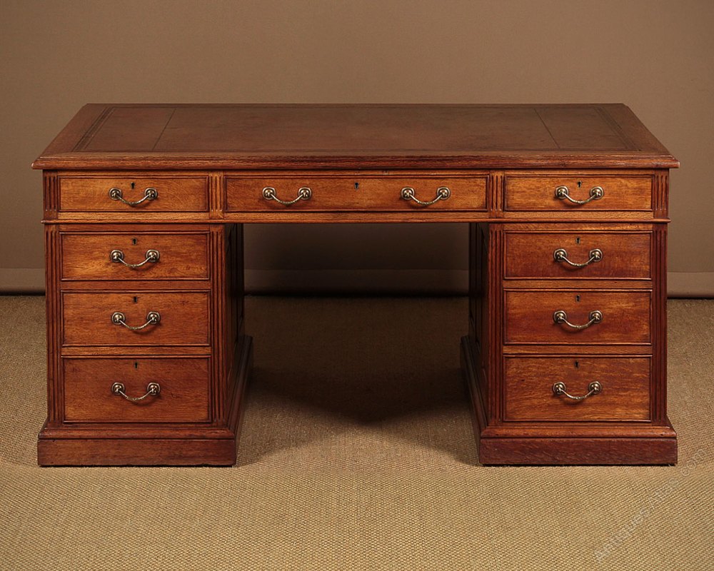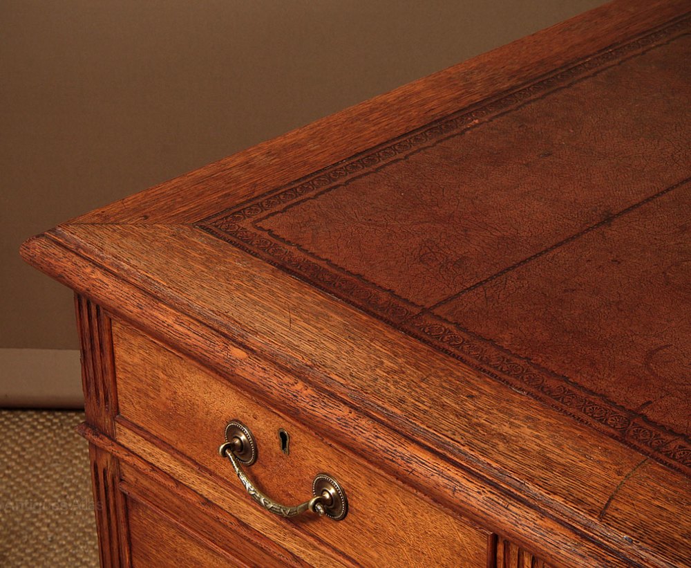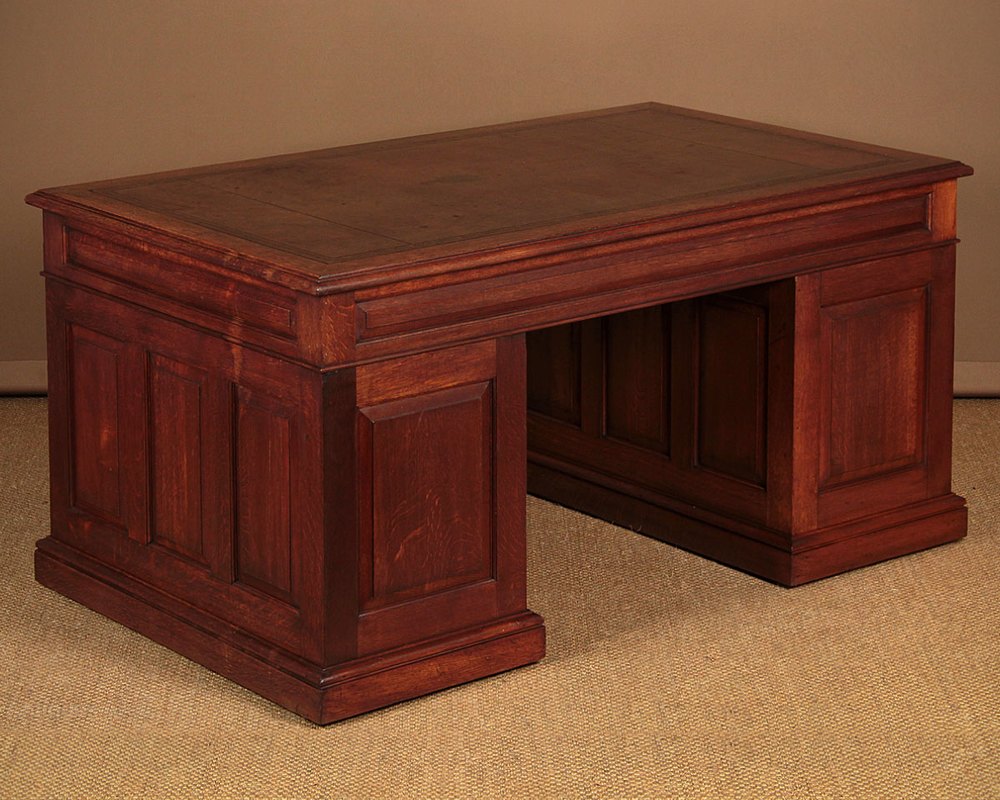 Quality Edwardian oak pedestal desk c.1905. Good large size, five feet by three feet top with a tooled leather work surface and moulded edge over three drawers. Raised on twin pedestals, each with three drawers of graduated depth either side of a 24″ wide x 24″ high kneehole. Oak drawer fronts with cockbeaded edges and original brass handles, oak drawer linings (with unusual moulded top edge to the drawer sides). Fluted detail to the uprights either side of the drawers. Raised and fielded oak panels to the sides and rear. Moulded plinths with original castors below. Typical old wear to the leather, generally excellent condition cleaned and waxed in our workshops. Keys supplied.