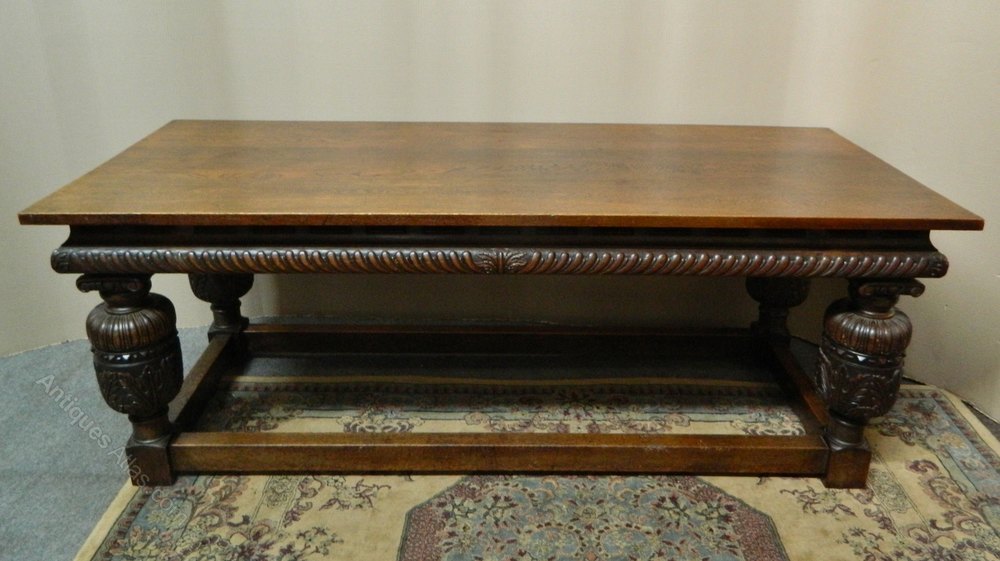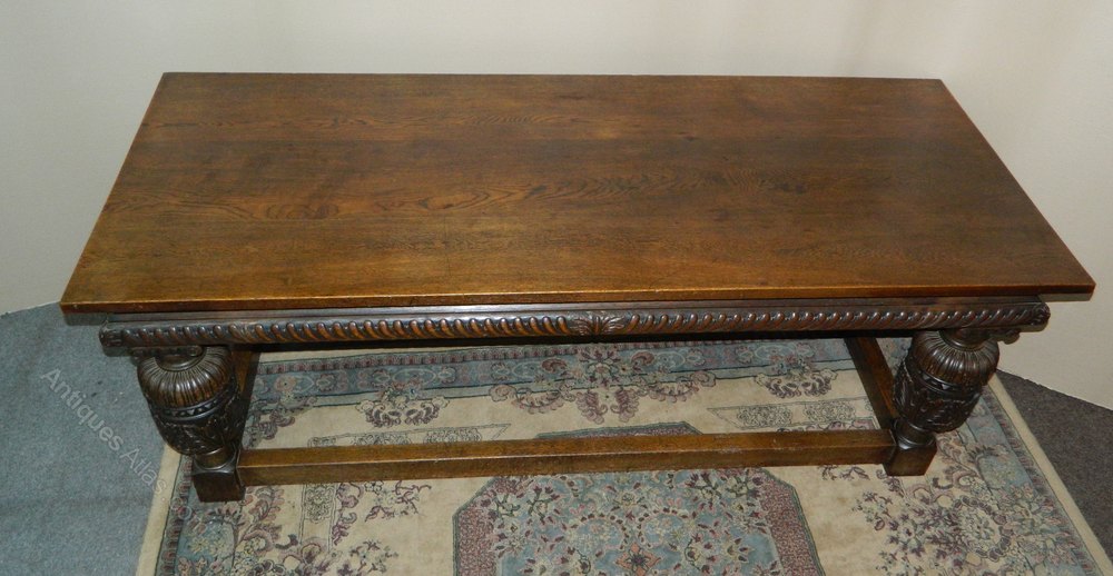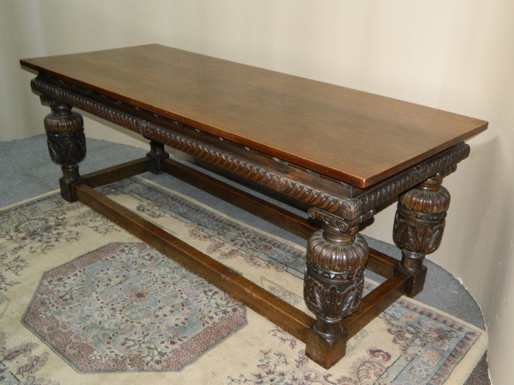 a most substantial table with planked top, lovely carved detail to all sides of the frieze and raised on large bulbous carved legs united by stretchers.