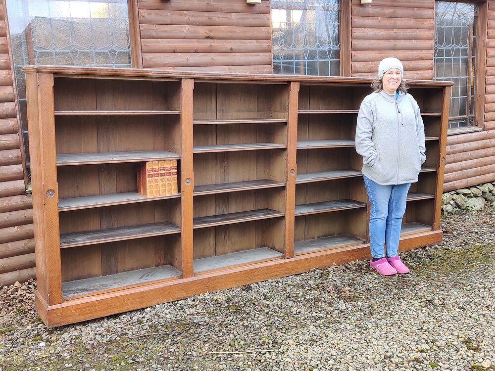 A fabulously large 19th century 3.6 metre long (12 ft) and (5 ft) high open front bookcase in oak, with 16 adjustable shelves this will hold a lot of books among other things. Is in lovely condition with a very good patina. (It dismantles into four sections, two separate bookcases, a lower plinth and top for ease of moving.)