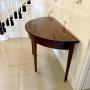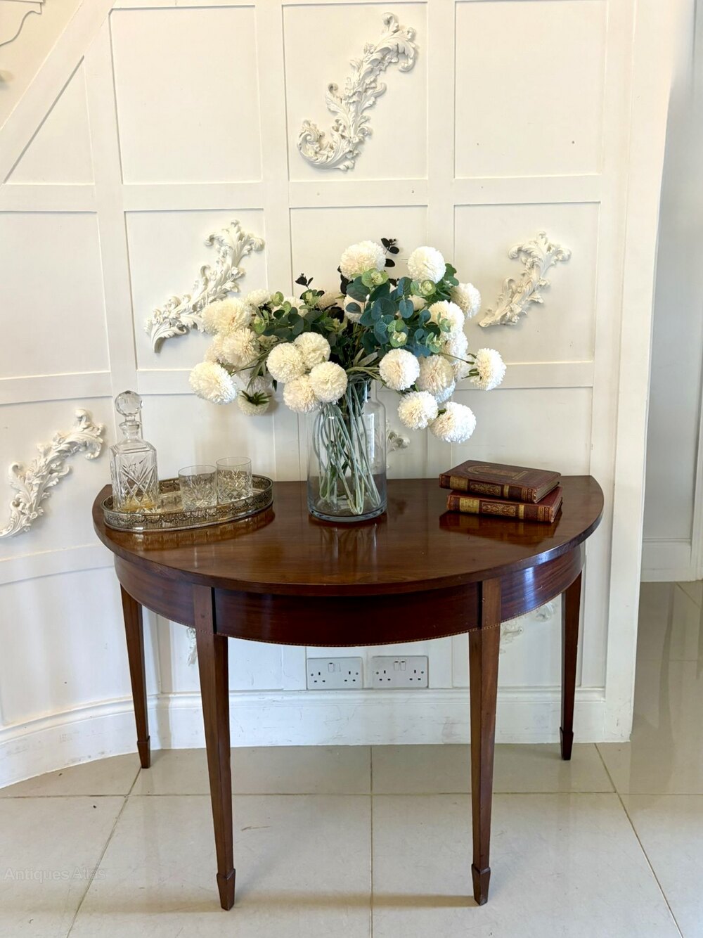 Large pair of antique George III quality figured mahogany demi lune shaped console tables having a quality figured mahogany demi lune shaped top above a demi lune shaped inlaid frieze standing on four elegant square tapering legs with spade feet.