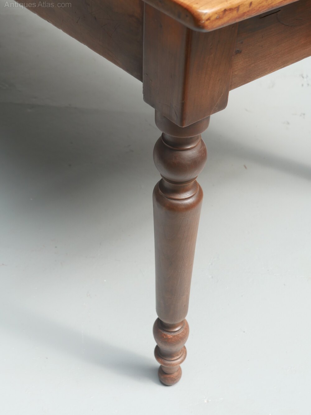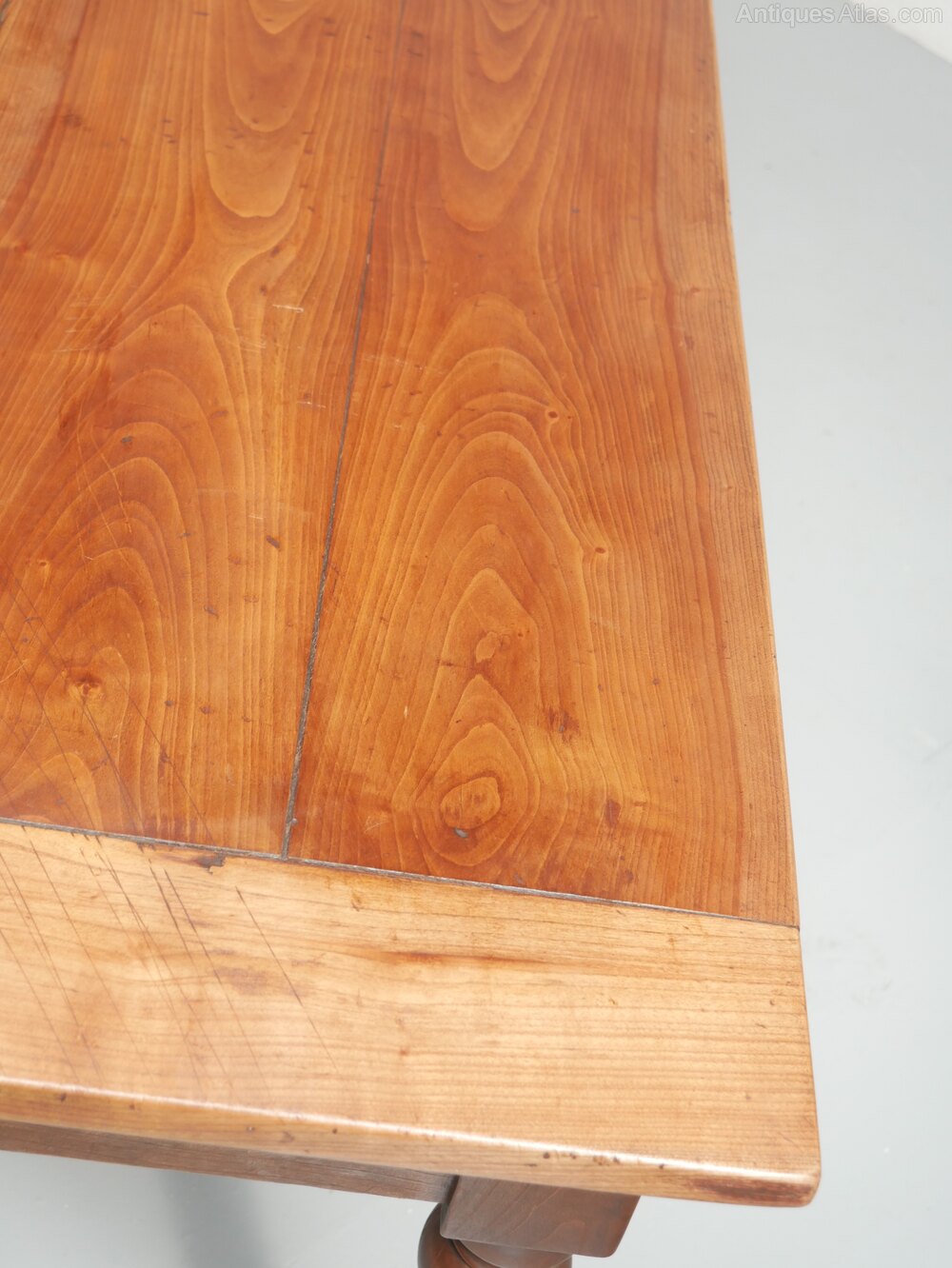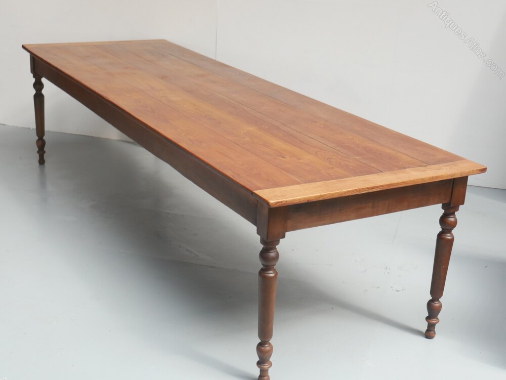 A large 19th century farmhouse table in cherrywood, standing on traditional turned legs. The table is in good strong condition, with a lovely colour to the top, made around 1860, seats ten very comfortably.