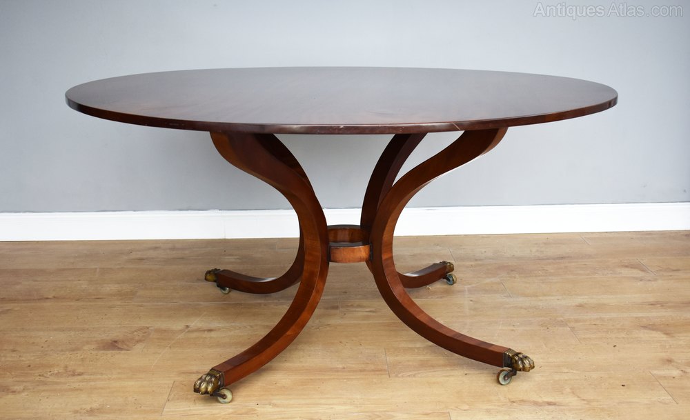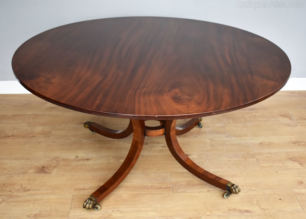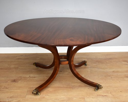 For sale is a very good quality Regency style circular solid mahogany dining table, the top being made from beautifully figured mahogany, fits onto an elegant base standing on splayed legs terminating on brass castors. The table is in very good condition, showing minor signs of wear commensurate with age and use.