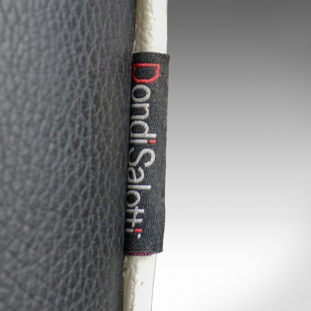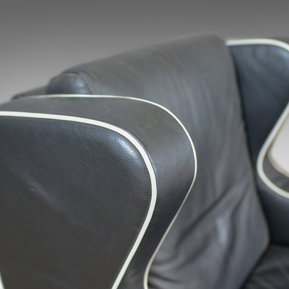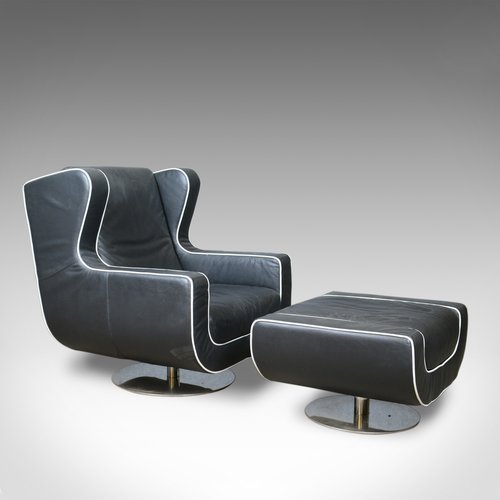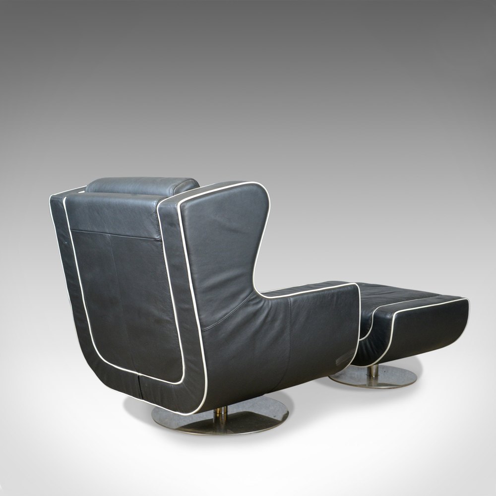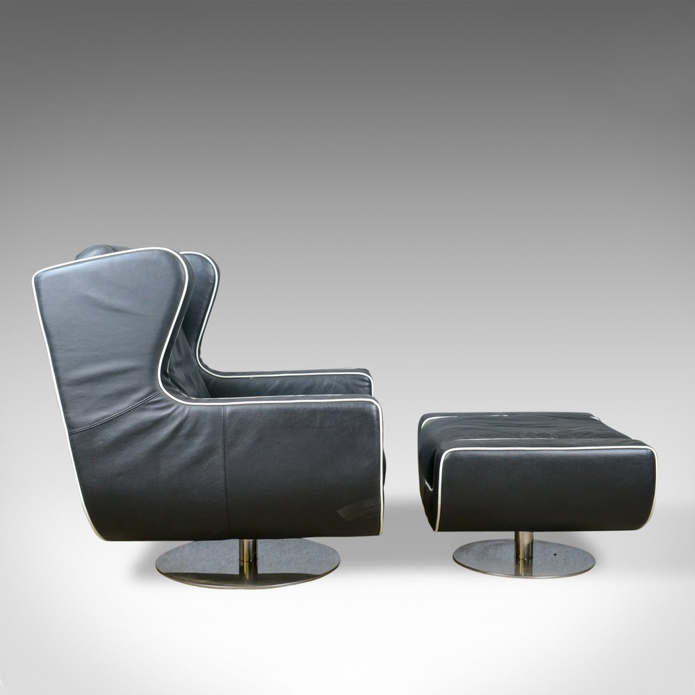This is a large, retro, vintage 1980's, black leather armchair and pouffe by sought after Italian designer Dondi Salotti.